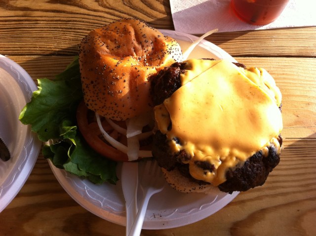While we were waiting for our food, a pair of snowbirds landed and ordered at the table next to us. They talked for a bit and they they ordered a burger. Each of them. Twenty minutes later, our food shows up. We hear Papa Snowbird say to Mama Snowbird, “oh my, we probably should have split one….”