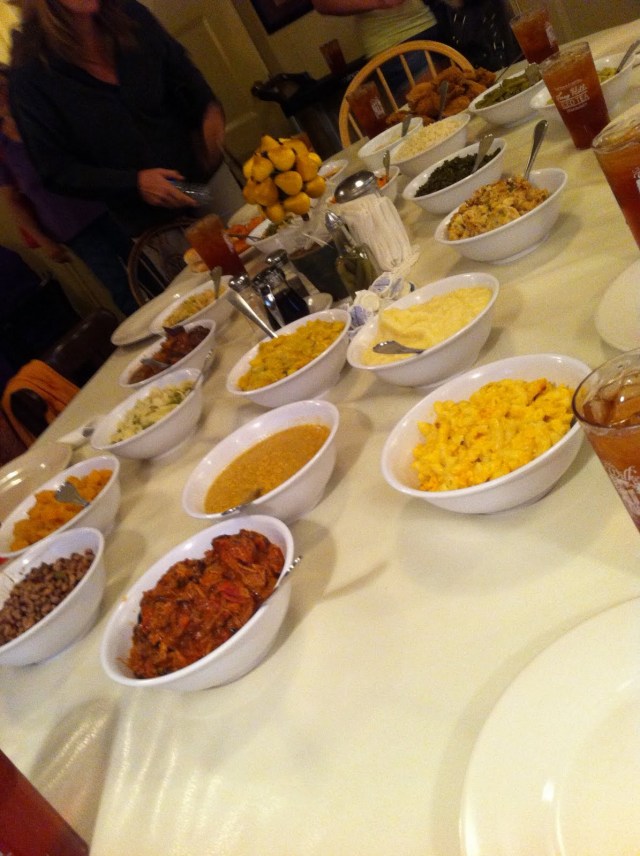 The table was covered in a veritable cornucopia of food – fried chicken, barbecue, roast beef, macaroni and cheese, green beans, field peas, butter beans, fried okra, squash, mashed potatoes, tomatoes, biscuits and cornbread, and at least ten more bowls.