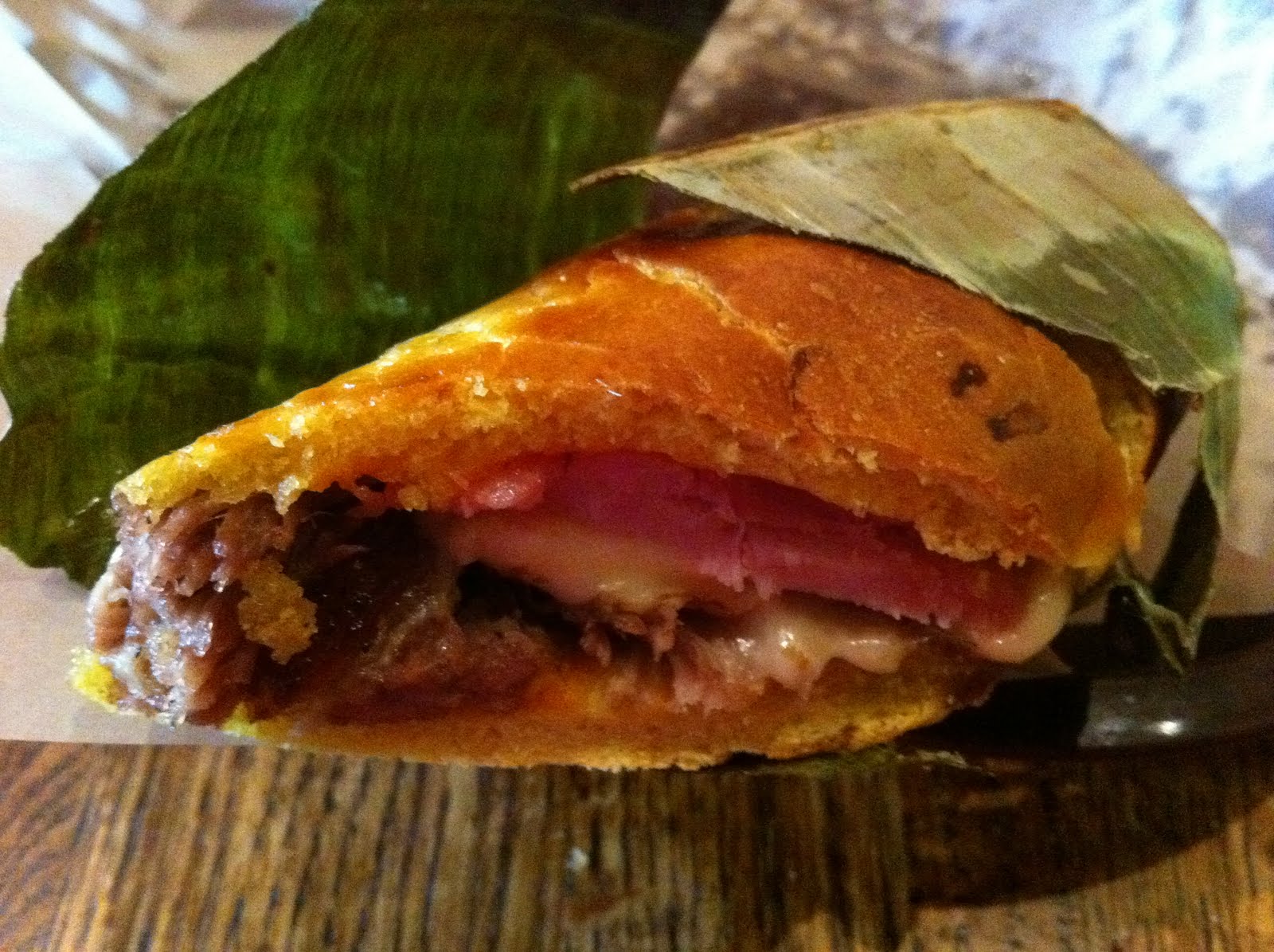 Looking over the menu, I decided on the Medio Dia, literally “the middle of the day”, idiomatically translated as “lunch”.  Crispy roasted pork, ham, chayote pickles (held for me), swiss, habanero mustard (mmmmmm) on a steamed coconut bun.  What a great lunch spot.