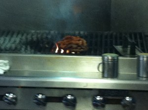 Before going in, I had decided, after the meal (approximately a pound of beef, bacon and french fries) at Hodad’s, that I’d just eat half of a burger. Looking over the menu, the choices were vast, but I went with the “Wild West Burger” – a half pound burger, with gyro meat on top, barbecue sauce and bacon (I passed on the grilled onions). This thing was AWESOME. I stopped in the restaurant, before I went back out to the car and took a picture of this behemoth: