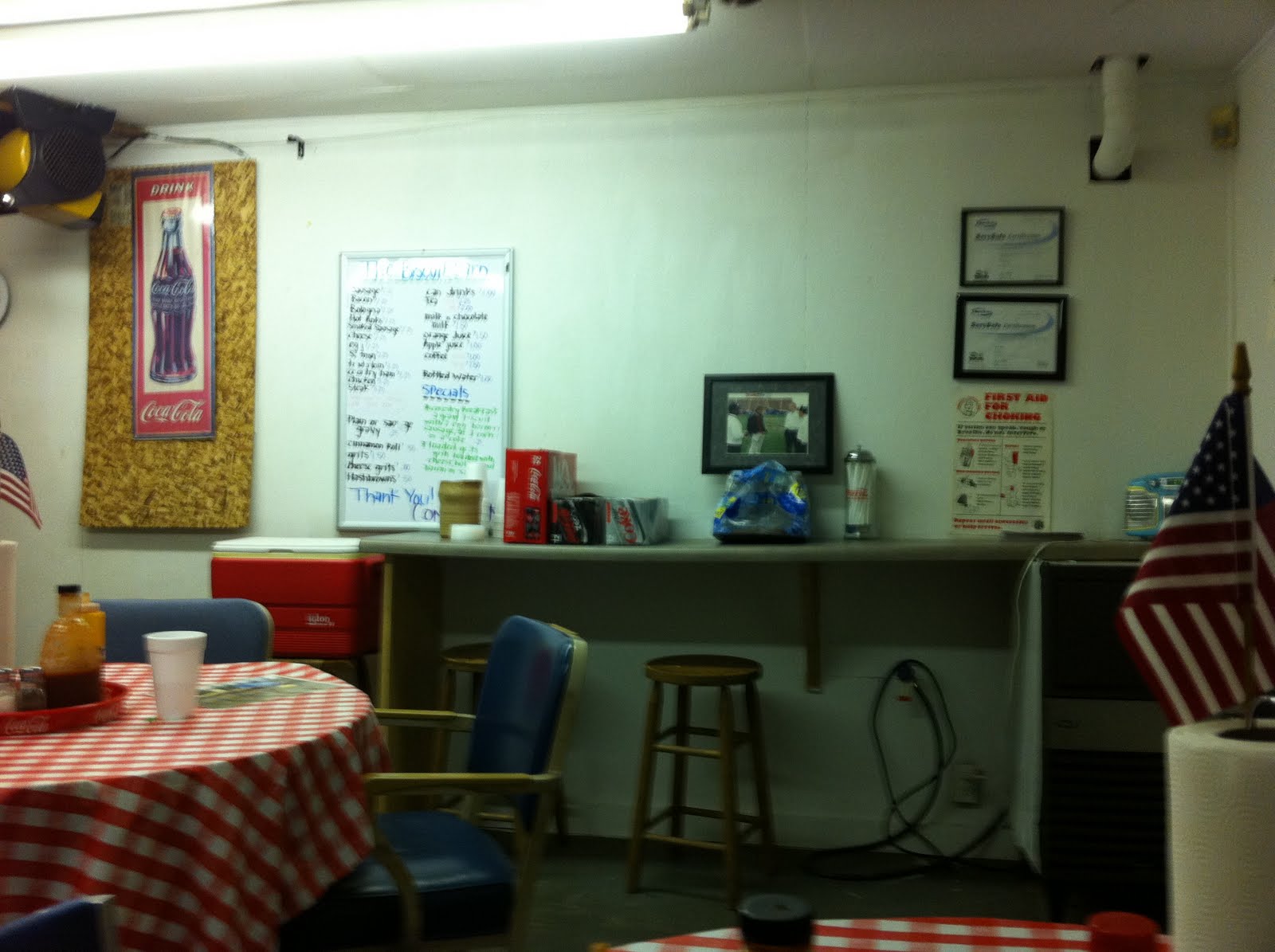 The waitress said “Take a seat and I’ll bring it to you.  Grab whatever you want to drink from over there.”  “Over there” was an igloo cooler full of ice and a metal scoop, two twenty four packs (Coke and DIet Coke) and gallon milk jugs of sweet and unsweet tea and lemonade.  I took a seat at the table and eavesdropped on the three regulars sitting there.  They were locals, discussing gas prices and the local bank.