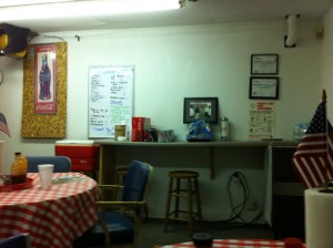 I arrived at a place that looked like a hole in the wall, if there ever was one.  Inside the windowless room, there were three round tables and about fifteen chairs.  Here is the right side.  On the left side was a doorway which led about 6 feet to a screened door going out back.  Halfway down that hallway was an opening into what looked like a kitchen from the late sixties – counters on both side, a small fridge and lots of pots.  The menu, such as it was, was on a chalkboard by the door.  I talked to the man in the kitchen, who turned out to be Phil (the owner and pitmaster) and told him I wanted ribs and brisket in whatever the best configuration would be.  He suggested a plate and I agreed.