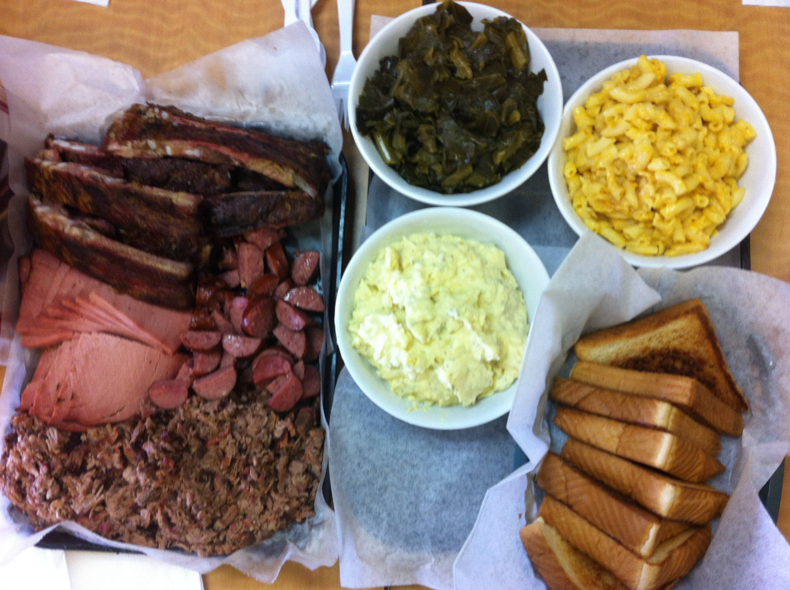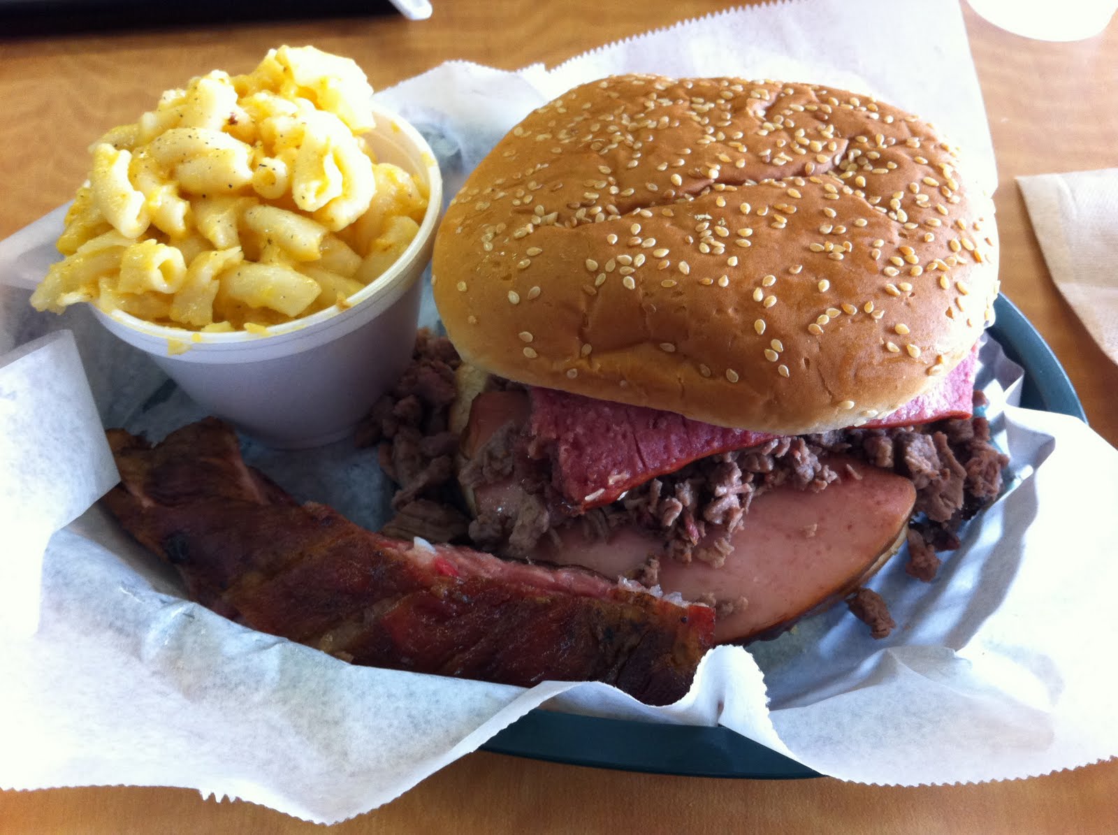 It’s a sandwich of beef bologna, chopped beef brisket and beef sausage, with a side and a beef rib. I took the photo below to get a better “feel” for the sandwich. I’m just a redneck at heart, ’cause I love me some bologna. The brisket is beautifully done and they have the perfect sweet, hot sauce on the table. The ribs are good, too. But I’d suggest the same sandwich I’ve ordered each of three times I’ve been in the past two months. It’s definitely worth a stop if you’re within 10-15 miles. I recently went back with a couple of other folks and we ordered a meal for three. If they had done their part, we might have come closed to finishing.