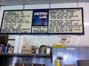 Walking in, I see that they are open 24 hours, and I’m in luck because Thursday is $0.99 Coney Day!!