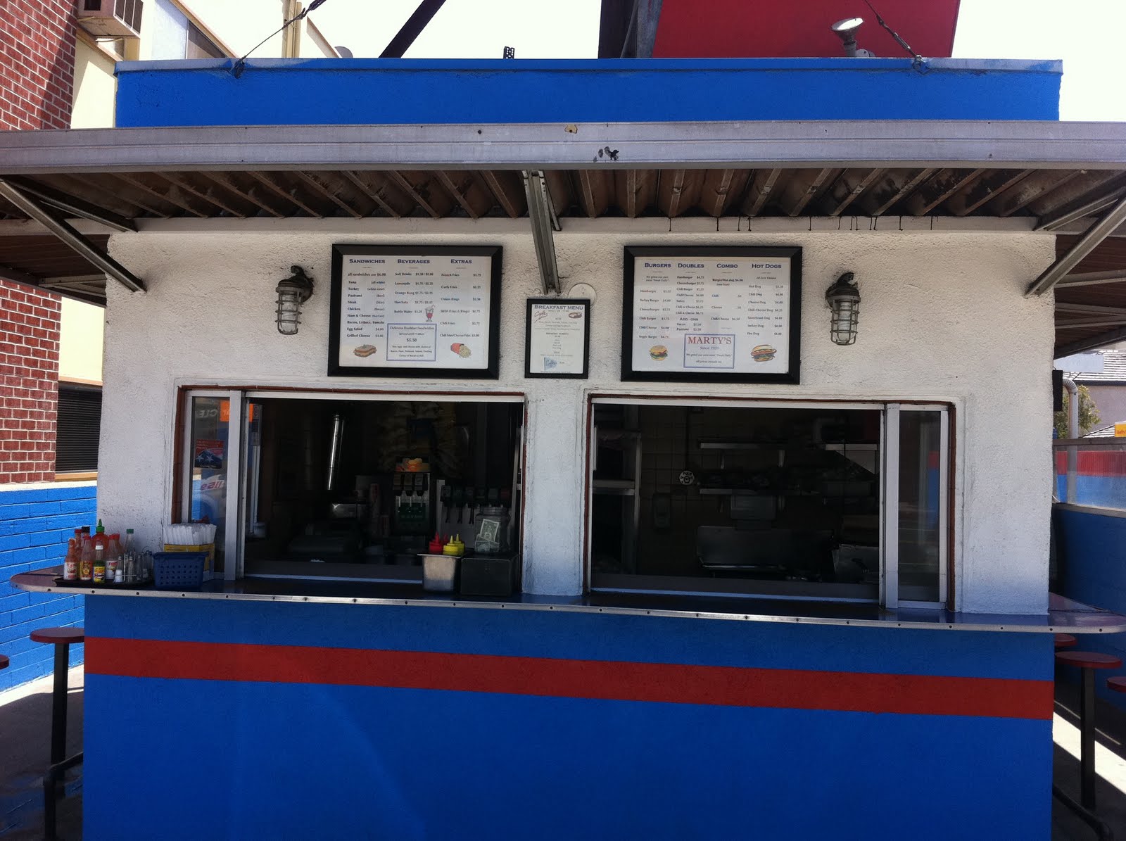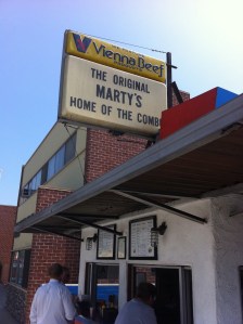 Open since 1958, Marty’s is “Home of the Combo”. I’ve eaten “combos” my whole life, but never one like this. Every fast-food joints has made it a combo when you add fries and a soft drink to your sandwich. Marty made it simple. A “combo” is simply a hot dog and a hamburger on the same bun. Brilliant. This grill is right through the window on the right.