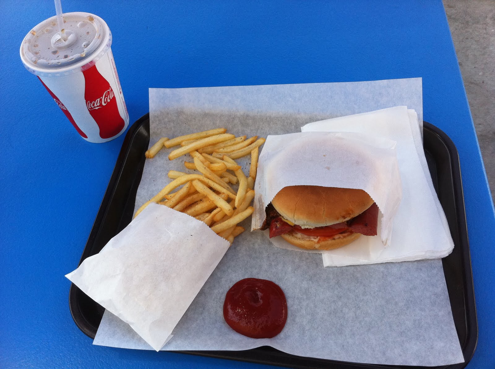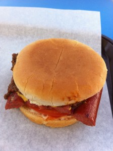 As you order, they pull out a ground beef ball (measured and rolled fresh daily) and slap it on the grill, mashing it nearly flat. And here’s the result. My “combo” combo.