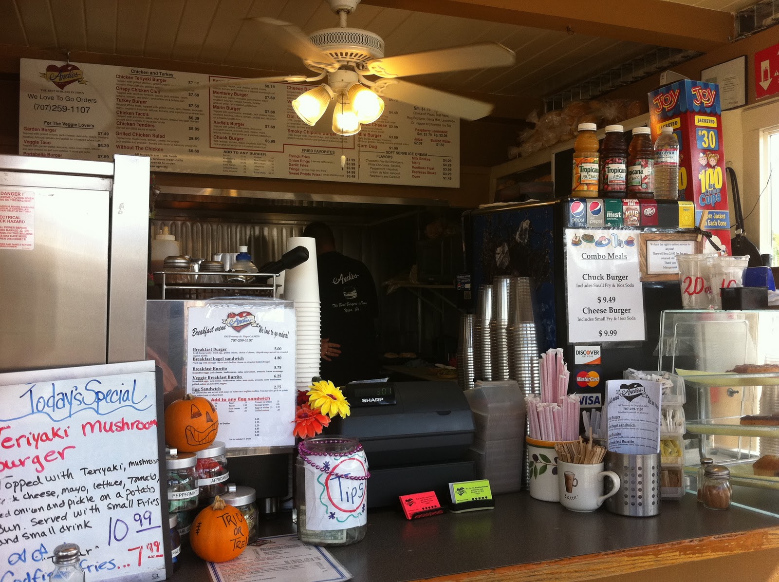 So I wander back and find Jo in an antiques shop and while she’s wandering through, I strike up a conversation with the store-keep. Chat-chat-chat-chat and in the midst of the “what brings you here” and “weather-talk” and all, I mention the burgers. She says, “Have you been to Andie’s? I’m a vegetarian, but Susan swears they’re the best burgers in the Valley.” I get directions, find Jo another spot to shop and head off in the car.