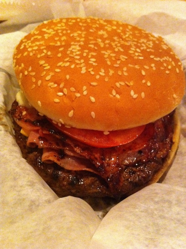 Walking in, it was Wednesday night and all of the regulars were carrying on lively conversations at the bar. Did I mention that this was a bar? The seating, to the right, was more like a Denny’s, with a bar down the left side. The waitress led me to a table, and listening to all of the folks around me, they all seemed to be ordering the same thing. So I ordered a Bonnie Burger – a 1/2 pound cheese-burger with 1/4 pound of shaved ham (??) on top.