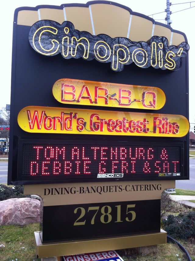So, I get inside and the first thing I notice on the menu is that they serve the “World Famous Montgomery Inn Ribs” (as endorsed by Bob Hope!), shipped directly from Cincinnati, Ohio. Let me get this right: This place has the world’s greatest ribs and they don’t even make them themselves?