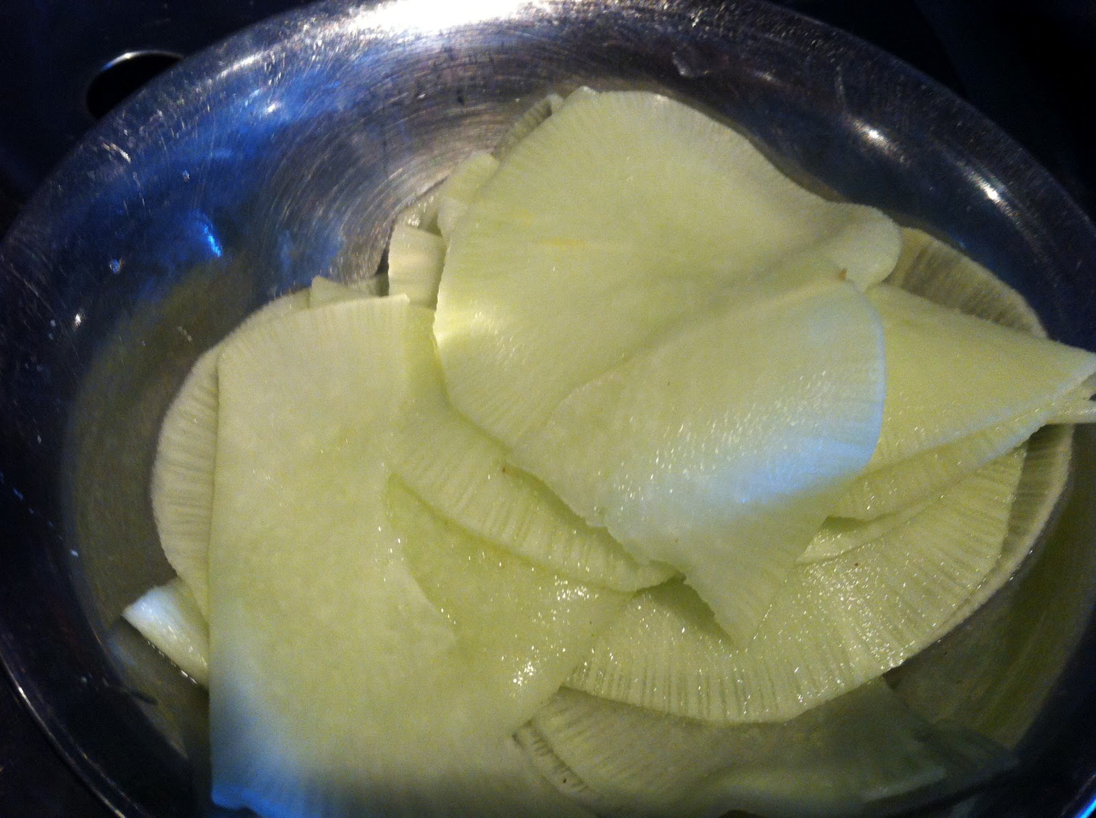 Radish wraps, marinated in wasabi. These deserved their own photo. These things were nasty. How can you make radishes take worse? Apparently, you marinate them in wasabi…