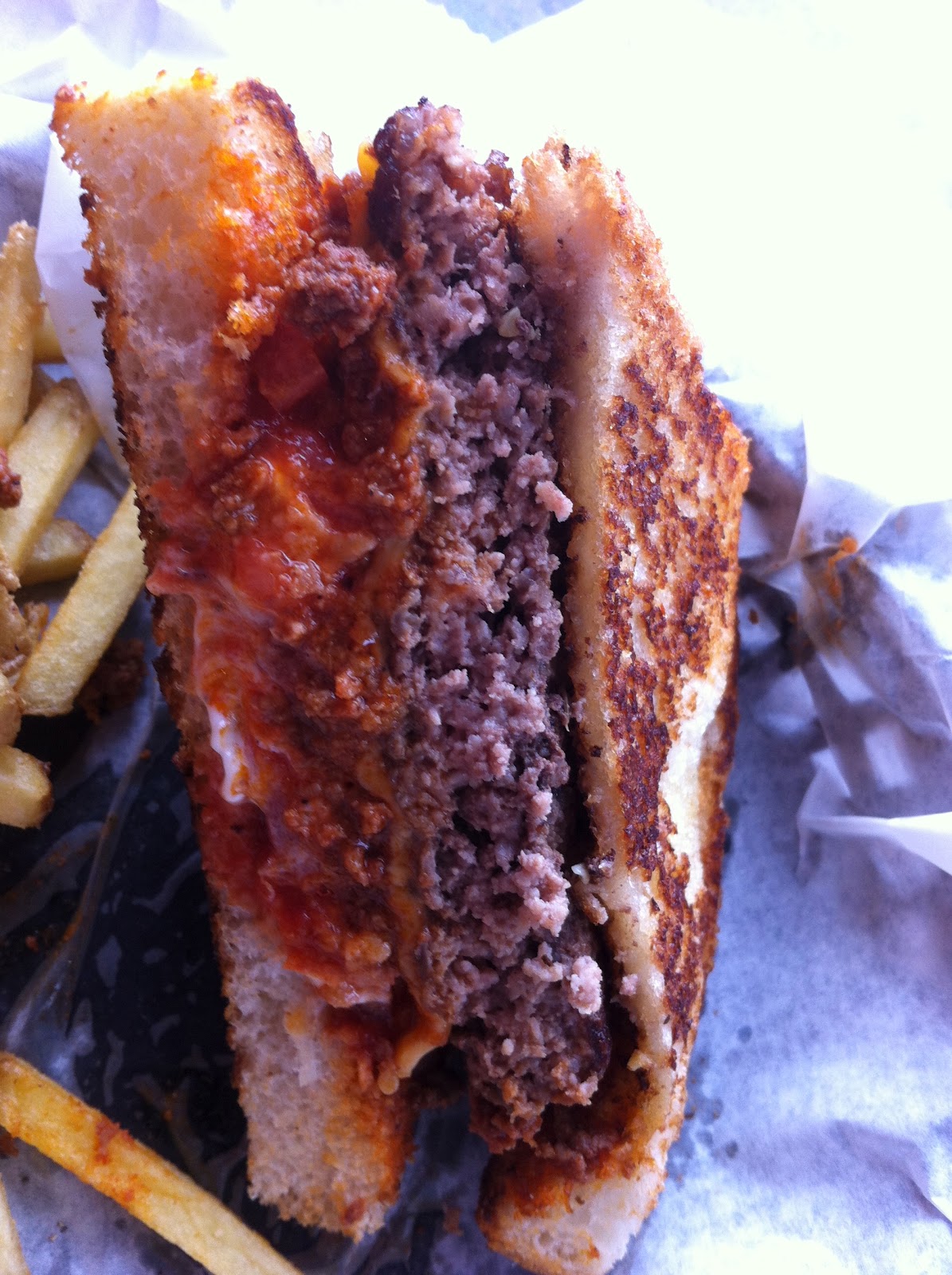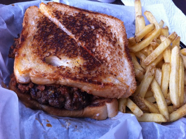 My burger was served on buttered, grilled Texas toast, covered in a very thin layer of Sloppy Jim sauce (a lot more like chili than the Manwich sauce with which I grew up), covered with cheese and mayo. The fries were good, but not great. The burger, on the other hand was very good.