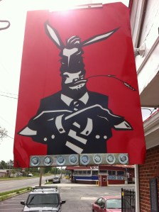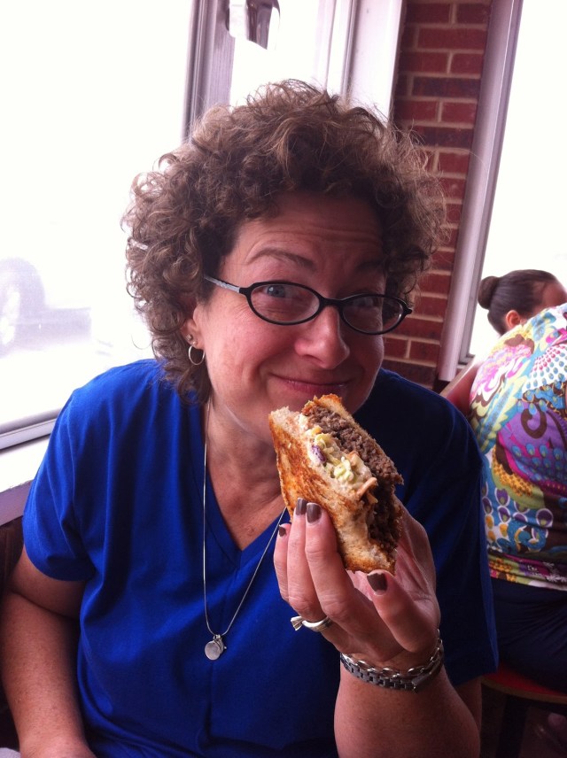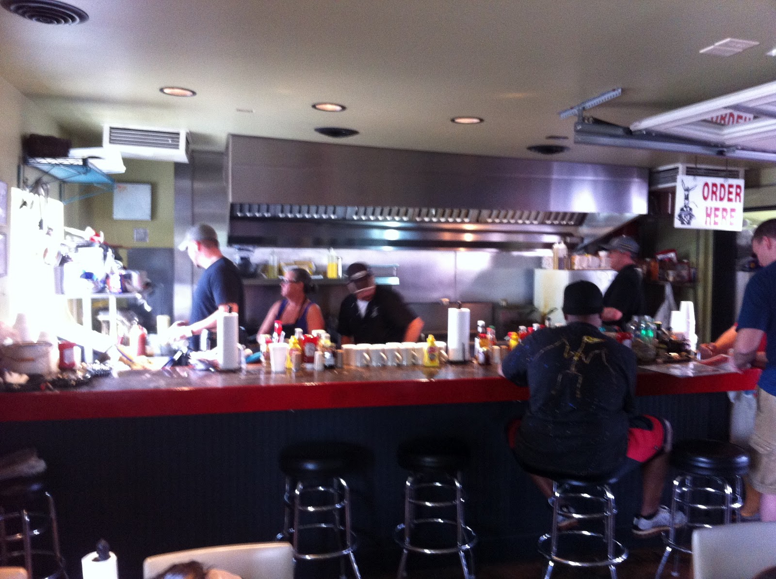 While running some errands one Saturday and looking for food, I remembered that there had been a couple of places with Marietta addresses in this month’s “Cheap Eats” article in Atlanta Magazine. A quick Google search from the USPS parking lot and the choice was made – the Red Eyed Mule. I knew we were arriving right at the cusp of breakfast v. lunch and figured we could both get something there. It was then that I saw that Alton Brown had named their Sloppy Slaw Burger on the “Messy” episode of the Best Thing I Ever Ate, and I knew that I would be having lunch.