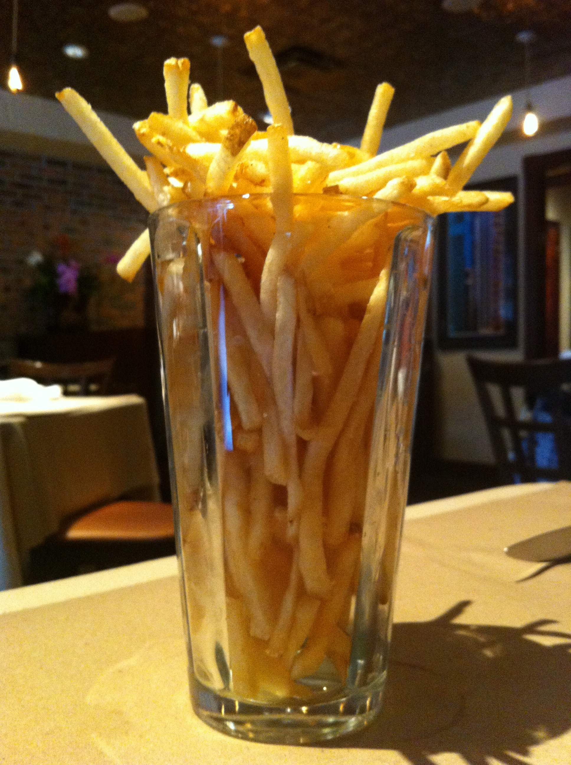 When my burger came to the table the fries were served in a separate bar glass. The burger was excellent. The service was exceptional. As we headed to the airport for the flight home, we both commented that that was the best meal we had while we were in Orlando. I guess we are food snobs after all.