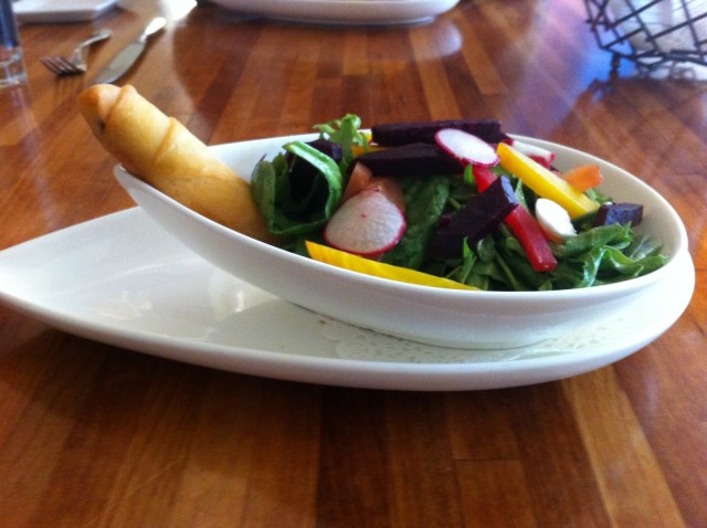 Arugula and tatsoi salad, with radishes and beets in a thai citrus vinagrette, with a goat cheese spring roll, to be exact. I didn’t go quite as healthy with the starter: