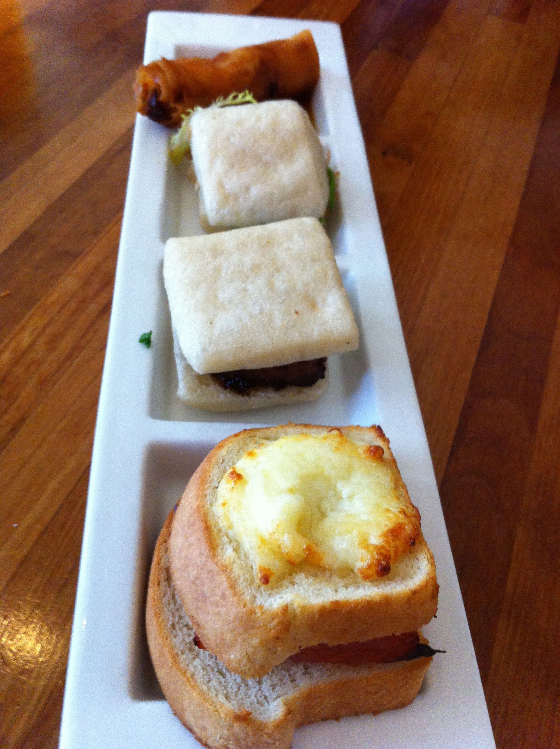 For an appetizer, we decided on Dim Sum – (from the top): a crab spring roll, with cilantro creme fraiche; duck confit steam bun, with truffled goat cheese; caramel pork belly on a steam bun; and a croque madame with tomato-onion marmalade. I liked the pork belly best. How can you not like uncured bacon on a Hawaiian sweet bun?Jo then ordered a beet salad.