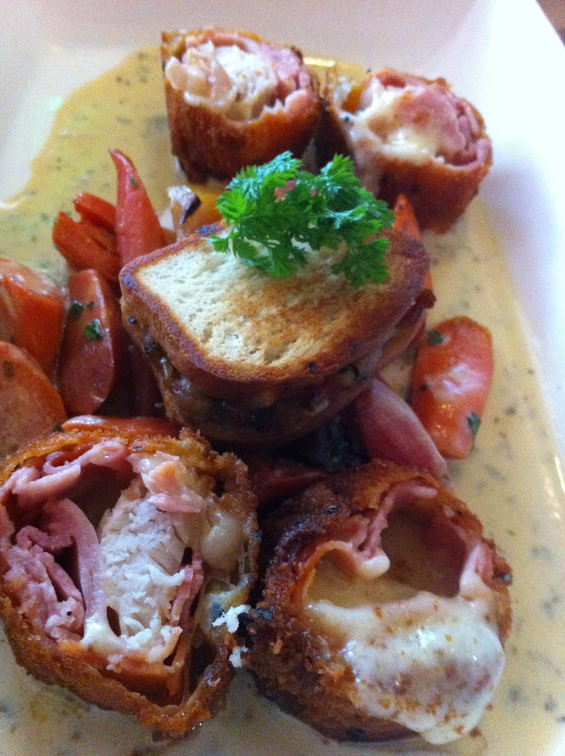 roasted rabbit, wrapped in ham and cheese and fried, served with a tomato/mushroom panini and brown butter carrots, on a bed of cilantro mustard cream.