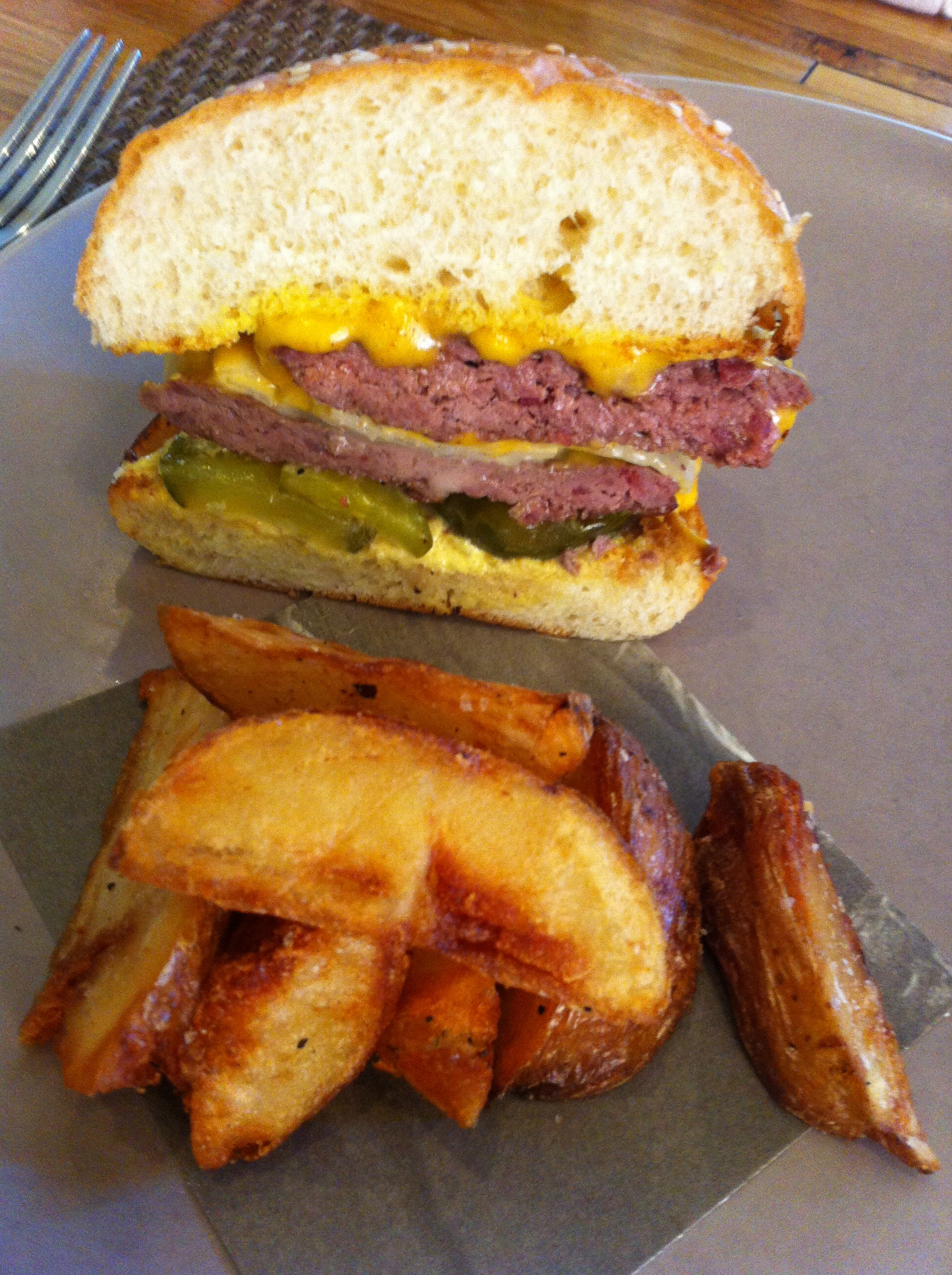 I was torn on the entrée choice between the hamburger and the pork terrine.  Realizing that the opportunity to get back to Husk was probably not going to occur in the near future, we ordered the cheeseburger as an appetizer for the two of us to split, and I ordered the pork for lunch.When the burger arrived it was presented on two plates – a half burger on each with a few fries.  It was exceptional just as I expected.