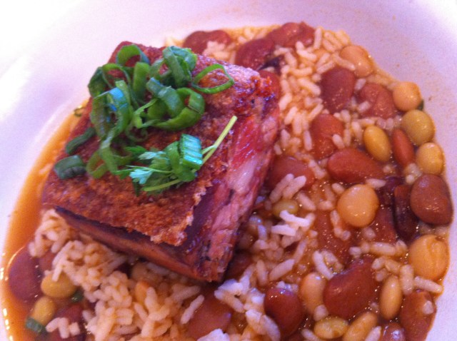 After the experiences with the terrine at the Ravenous Pig and FIG I was somewhat confused, but after discussions with our waiter, I felt a lot better about things.  It turns out this wasn’t actually going to be a terrine, but because of the shape in which it was presented that was the closest name they could come up with it for it.  The pork terrine was very different, than I expected – it most closely resembled a meatloaf made of pulled pork, served with beans and rice.   Meatloaf may not be the best description – it was like pork plywood, where all of the parts were pulled pork.   It was good, but when the beans and rice were added, the taste stepped up to great.