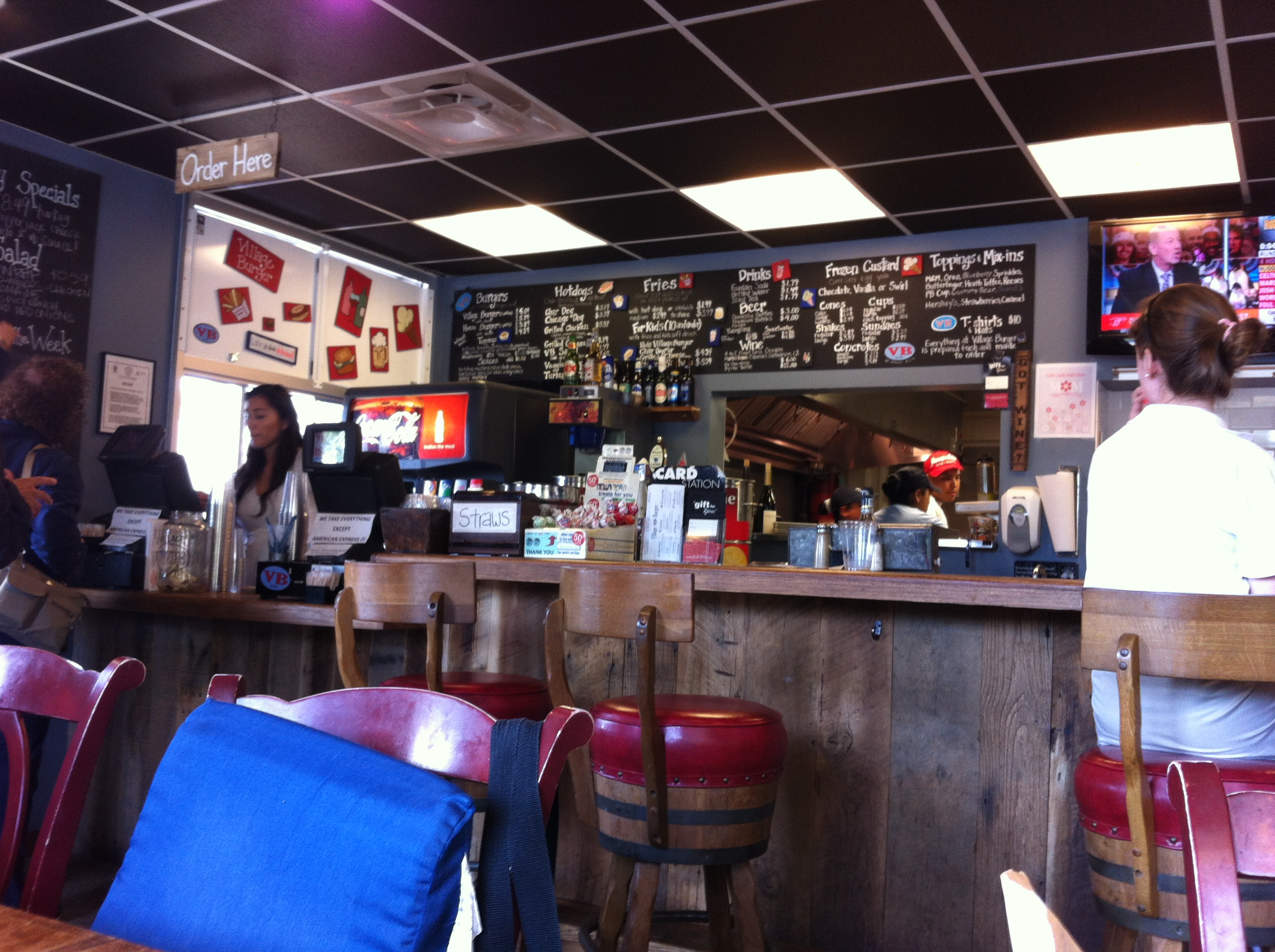 During my three-day bachelorhood, I was driving across the top end perimeter and figured it would be the perfect night to swing by and try out Village Burger. I arrived about 5:15 (at what appears to be a re-purposed Brewster’s) to find a few folks sitting at the bar and one family at a table in the corner. It has the look of a Southern California burger joint, where you walk in and place your order at a counter,