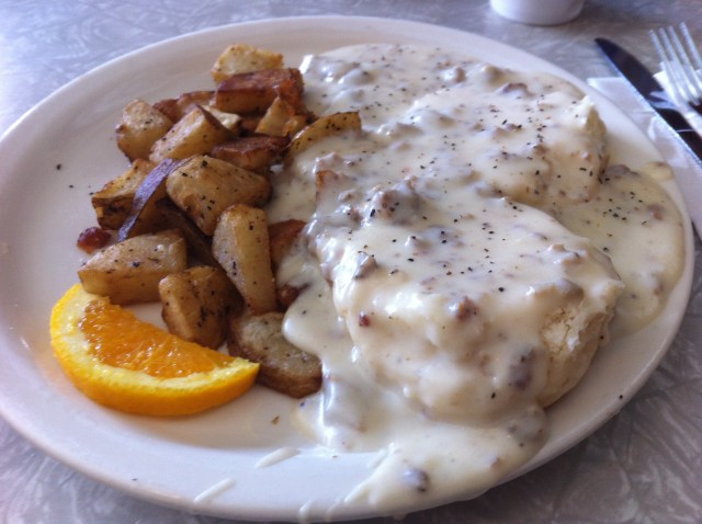 When it arrived, I took a bite of biscuit, “blanketed in gravy”. It was good. Really good. The gravy was thick, and chock full of sausage.