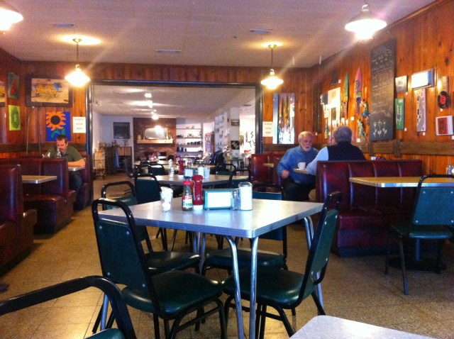 There is a counter right as you walk in the door, a few tables in the front room, and through the doorway that you can see in the middle of the picture above, more tables, a few booths and a thrift store.