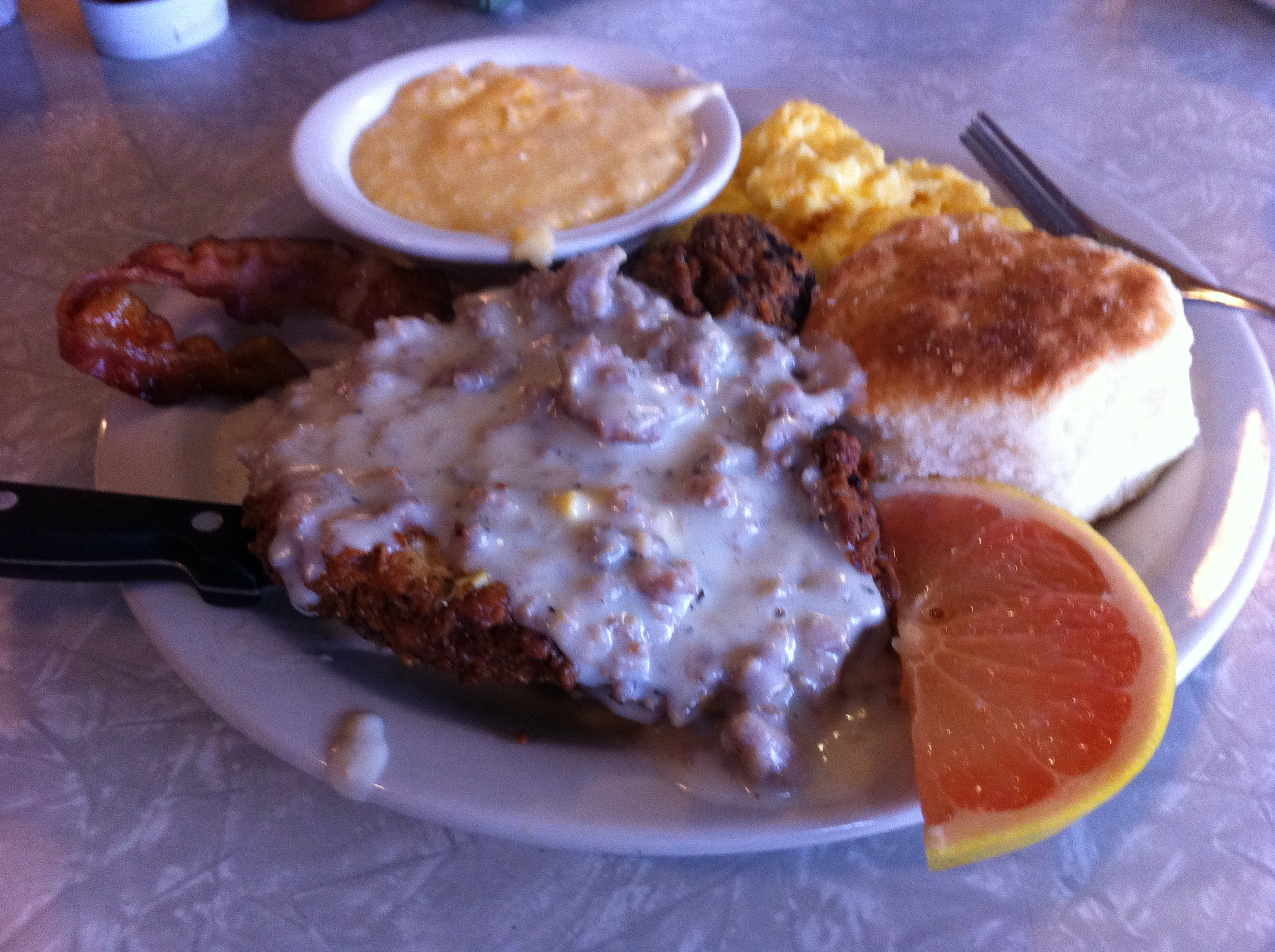 Then I tried the chicken – it was good, but I kept going back to the gravy. There is no other word for this sausage gravy than “otherworldly”. Okay, I could use the words “awesome” or “amazing”. But “otherworldly” is what came to mind. And has stuck there for days. I cleaned the plate, sopping each bite of biscuit till it was dripping gravy as it headed toward my mouth. As I was leaving, I told Lisa, one of the owners, my opinion of the gravy. She didn’t look at me like I was crazy. I imagine she gets that a lot <g>.