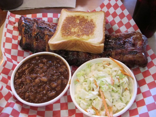 We go for the ribs.   I’ve had both barbecue pork and chicken, but the ribs rock.   This afternoon in May, Jo ordered a rack