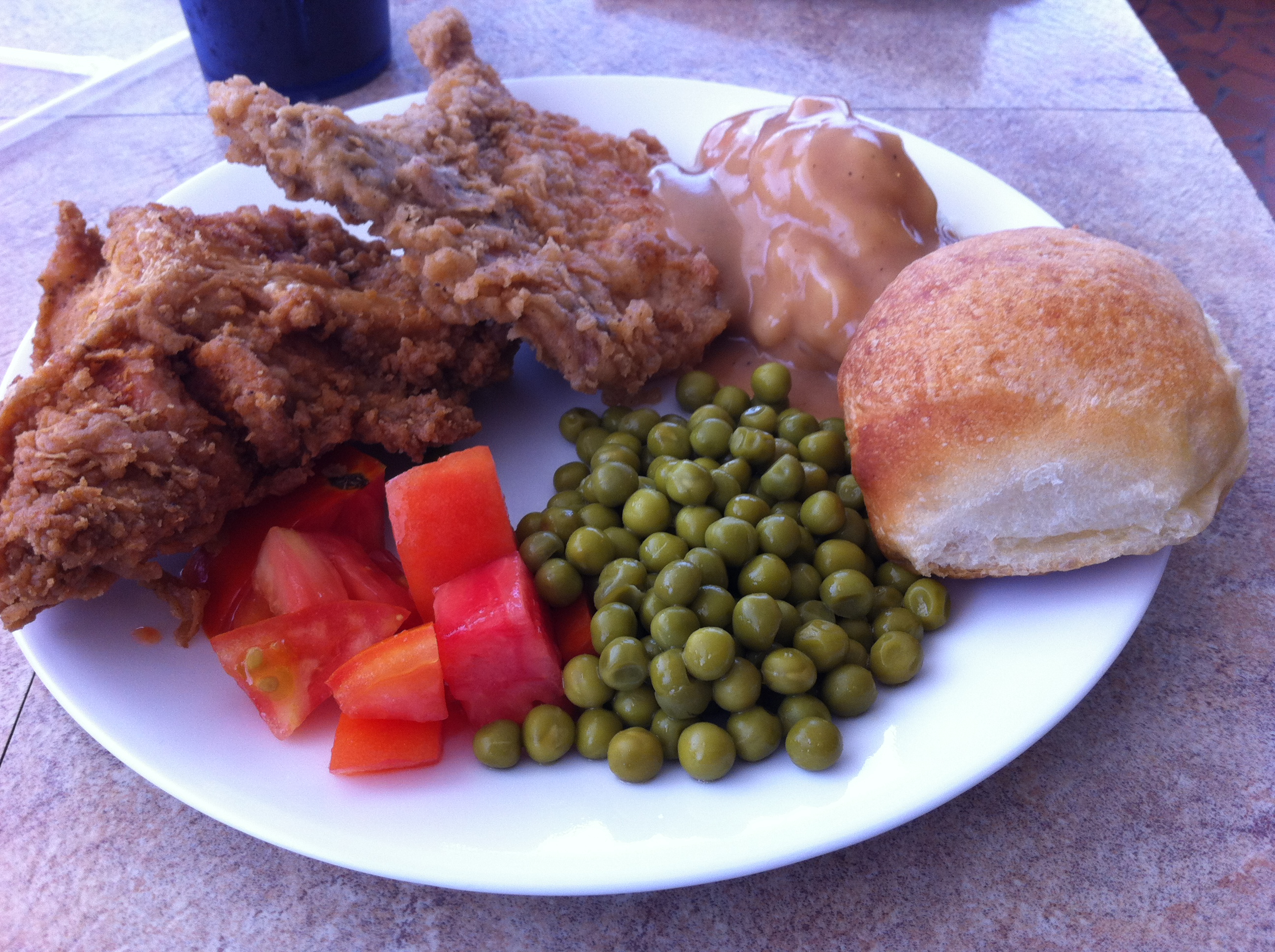 The fried chicken had a great crust, but the breast meat was kind of dry. One of the folks I was with had a leg, followed by a wing, and said that the dark meat was juicy. Cooking both white and dark meat to tastiness is an art which many folks can’t master. The roll was good. That just leaves the pork chop.