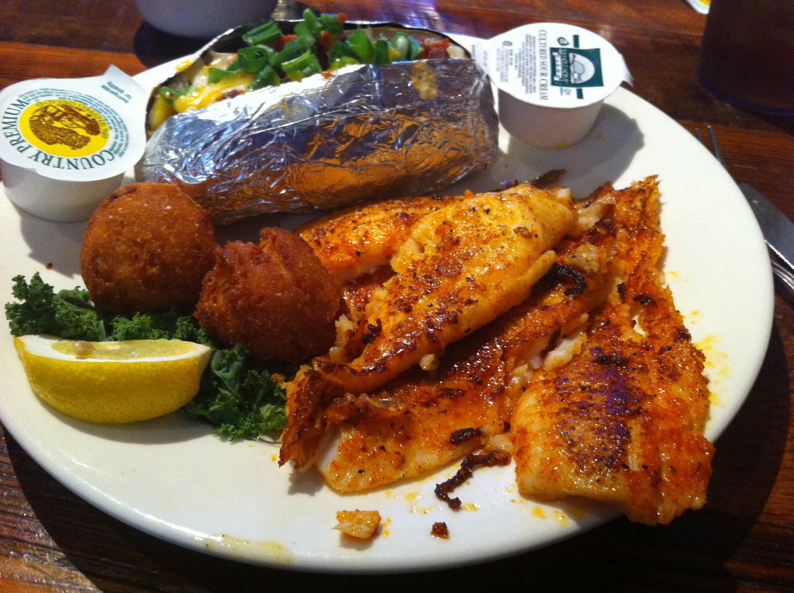 It was 5:30-ish and the place was about a third full. The decorations were those of an old seafood shack combined with random plans and posters of industrial boilers and ships. I ordered the blackened tilapia with a baked potato.