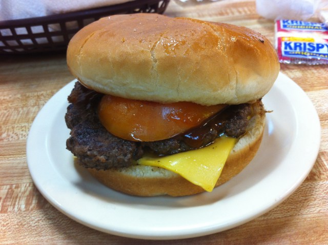 Earlier in the day – while I was learning that my first three choices weren’t going to work out – I had also been searching Google to find the best burger in Birmingham and was surprised to learn that Golden Rule made the top five list there. It said that the burger was fast-food like (thin patty, griddle cooked) but the ornamentation (lettuce, tomato, pickle, mustard and BARBECUE SAUCE) meant I’d have to try one of those, in addition to the ‘cue.