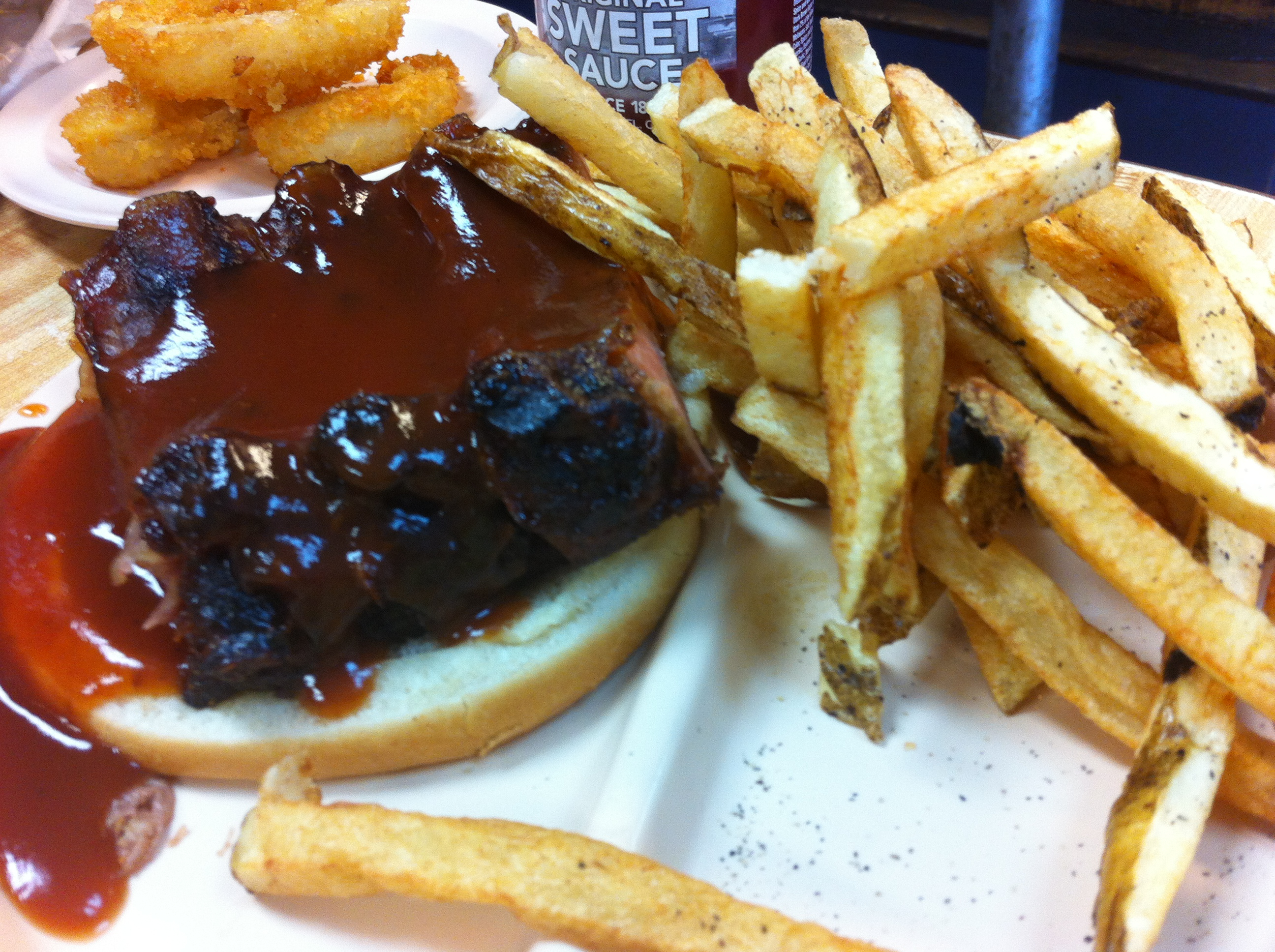 They were covered in Golden Rule’s house sauce, which was vinegar based and thin. I sampled the other two sauces, sweet (thick, probably molasses based) and hot (tasted more like cayenne than tabasco). The hot, mixed with the house sauce made for a decent mix.