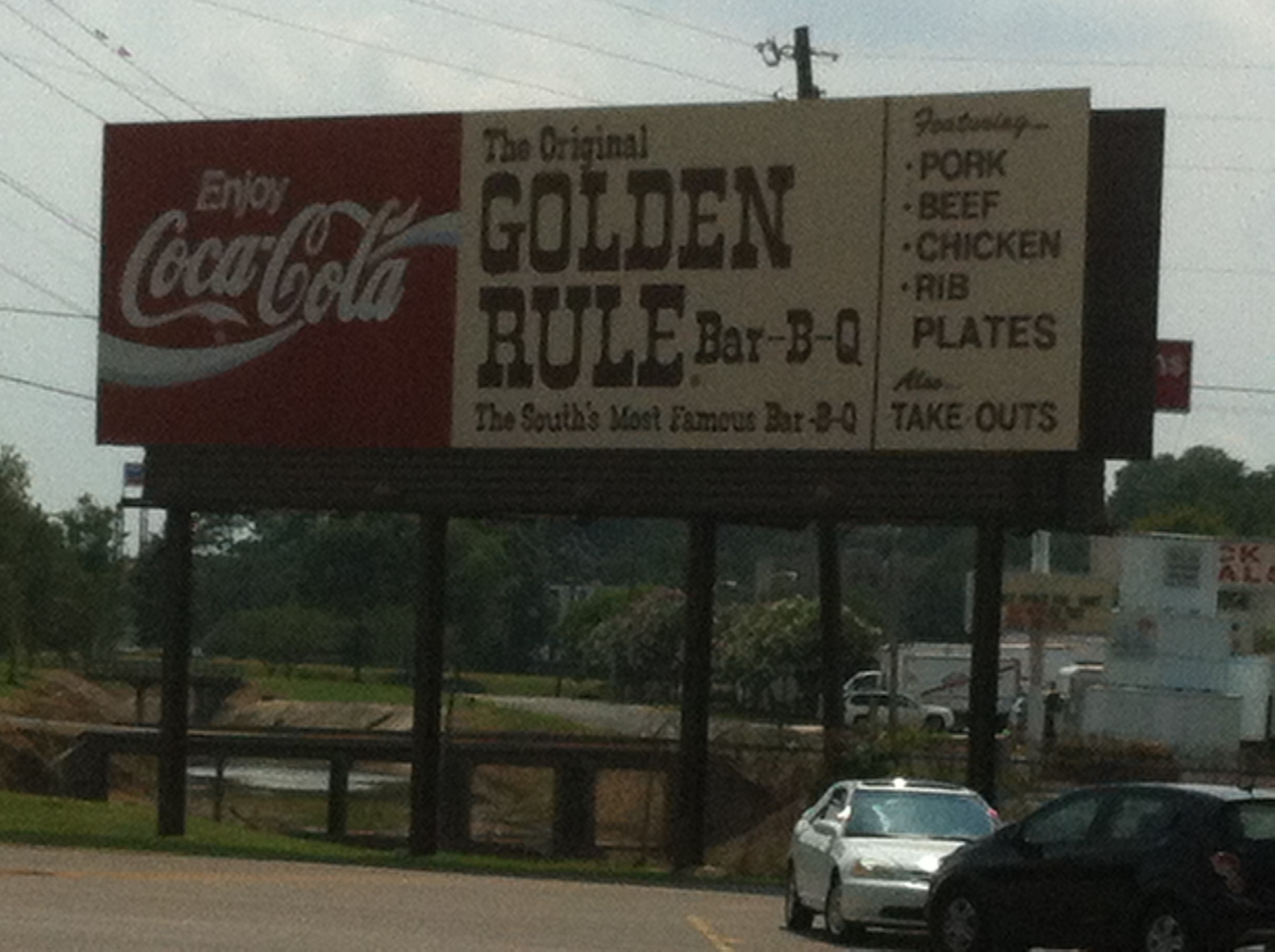 Back in the late 1990s, I ended up traveling to Birmingham often. And by often, I mean a lot. Over the course of about three years, I probably drove back and forth between Birmingham and Atlanta at least twenty times. Every one of those times, I drove by this sign for Golden Rule Bar-B-Q and Grill in Irondale – a suburb just east of Birmingham on I-20, before it merges with I-59. In the last ten years, I’ve probably driven by it a dozen more times. When I was looking for a lunch spot, and my first three ideas (McKinley’s Bar B Q and Soul Food – apparently closed for a couple of years – and Highlands Bar and Grill and Hot and Hot Fish Club – neither of which was open for lunch) didn’t pan out, I made the executive decision that today was the day to finally give it a try.