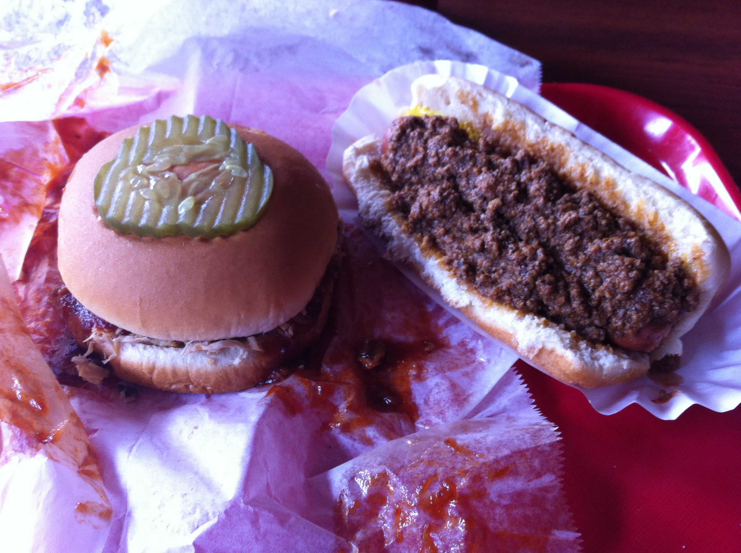 As to the food itself: The sandwich was covered in a thick tomato-paste-like sweet barbecue sauce. When I opened the sandwich up to find some meat with no sauce, there was little. But what I did find had no smoke taste whatsoever. Like a pork roast, but drier. The chili on the chili dog was spicy. Not bad, but spicier than I expected. When I went to grab a bottle of ketchup from the counter top of sauces, there was no ketchup among the Heinz 57, A-1, Tabasco and weird squeeze bottles (which all seemed to contain hot sauces). All they had were packets.