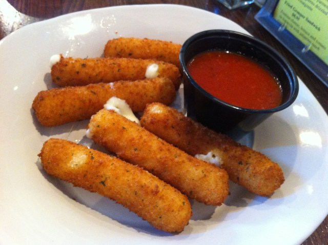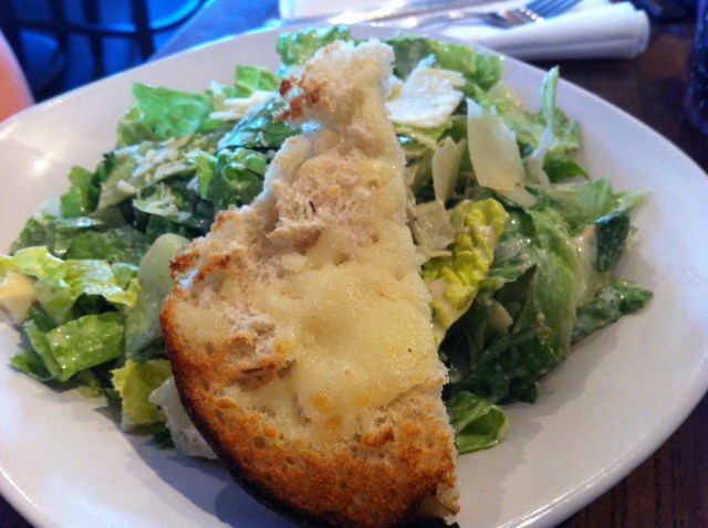 which she followed with Ceasar salad. She proclaimed the salad excellent (which means that there was very little anchovy in the mix) and we ate the entire order of cheese sticks. They were perfectly fine – nothing spectacular, but okay.