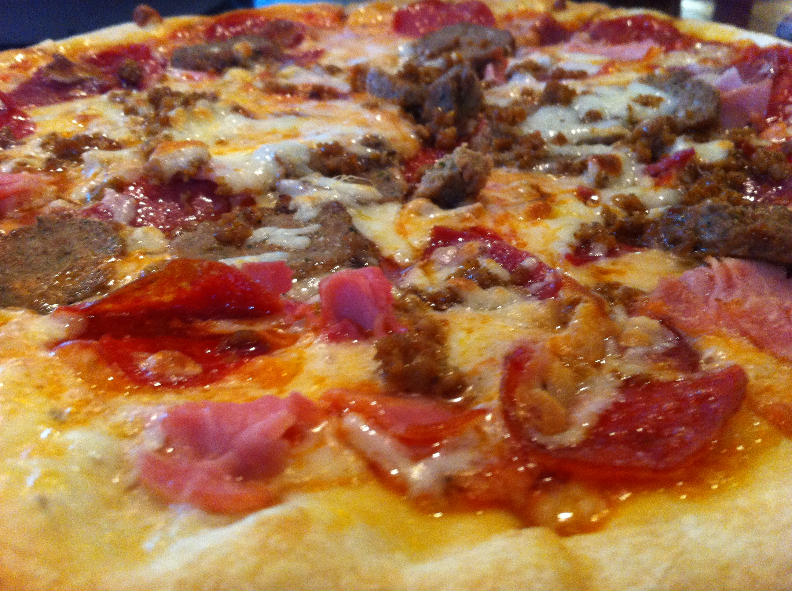 For our entrees, she chose chicken alfredo and I had a meat-intense pizza (with pepperoni, sausage, ham, meatballs and salami). The pizza was moderately thin crust and the tomato sauce was fairly average.
