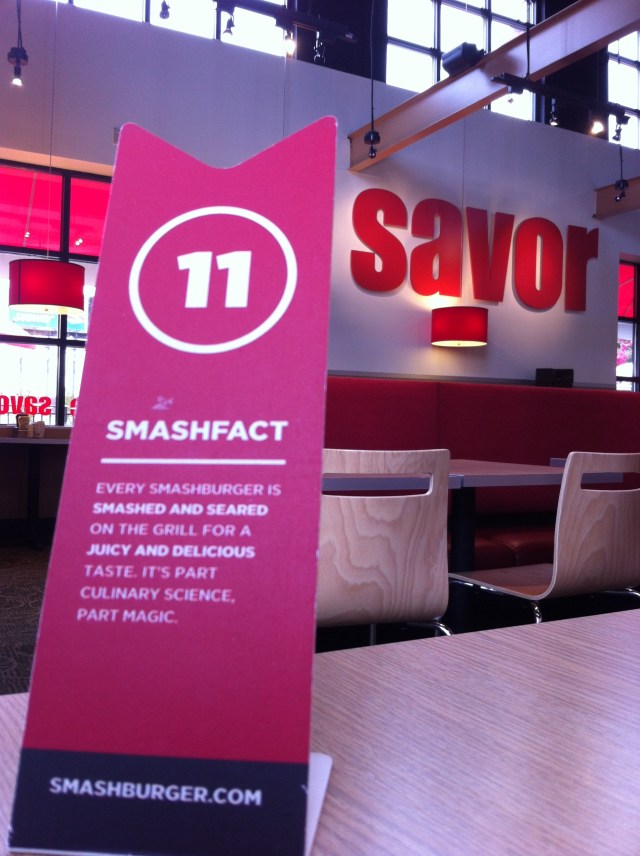 Similar to Five Guys, you place your order at the counter, they give you a number and then bring the food to your table. That seems to be the most obvious comparison. In fact, looking at the “buzz” section of their website several of the articles lump them together, strategy- and style-wise. And I did learn that the man behind SmashBurger is Tom Ryan – the man behind both stuffed pizza crust and the McGriddle.
