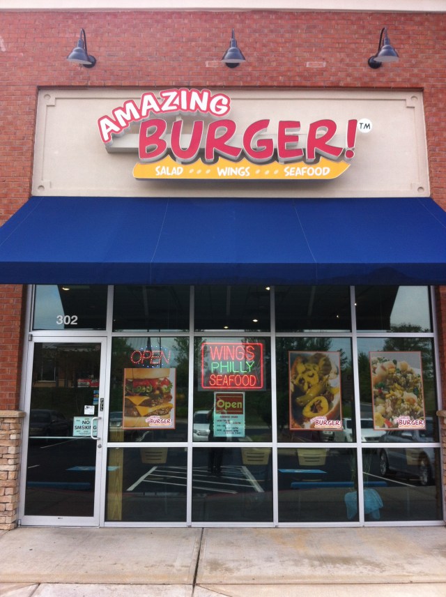While driving around Duluth a while back, I saw Amazing Burger in a strip shopping center in front of the Kroger on Steve Reynolds. I made a mental note of its location and thought that one day I’d swing by at lunch and see how it was. This Monday, with no one else around the office, was the day. I made the short drive, found a place to park and sauntered inside.