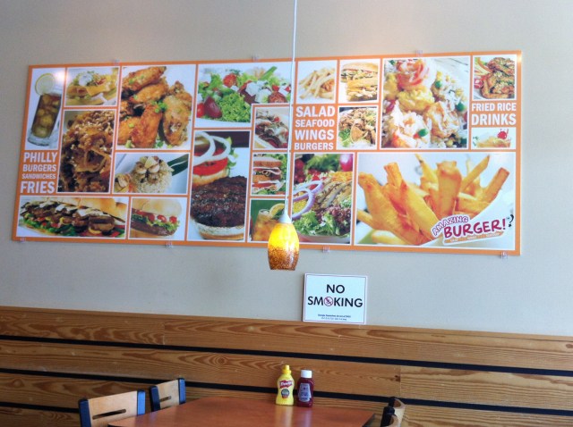 It looks very much like the new wave of burger joints in town (Canyon Burger, Boardwalk Burger, Smash Burger, etc) – you walk in through a “channel” of some sort (this was formed with the interior left wall to my left and a half height wall separating the order line from the dining room on my right). You then order at the counter. The menu was fairly broad, with burgers, salads, wings, seafood, phillies and fried rice. They give you a to-go cup to fill from the soda fountain and you find a seat.
