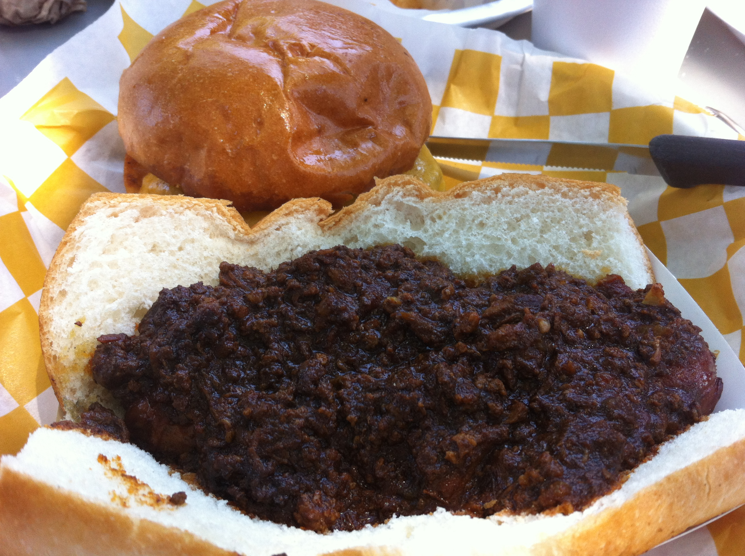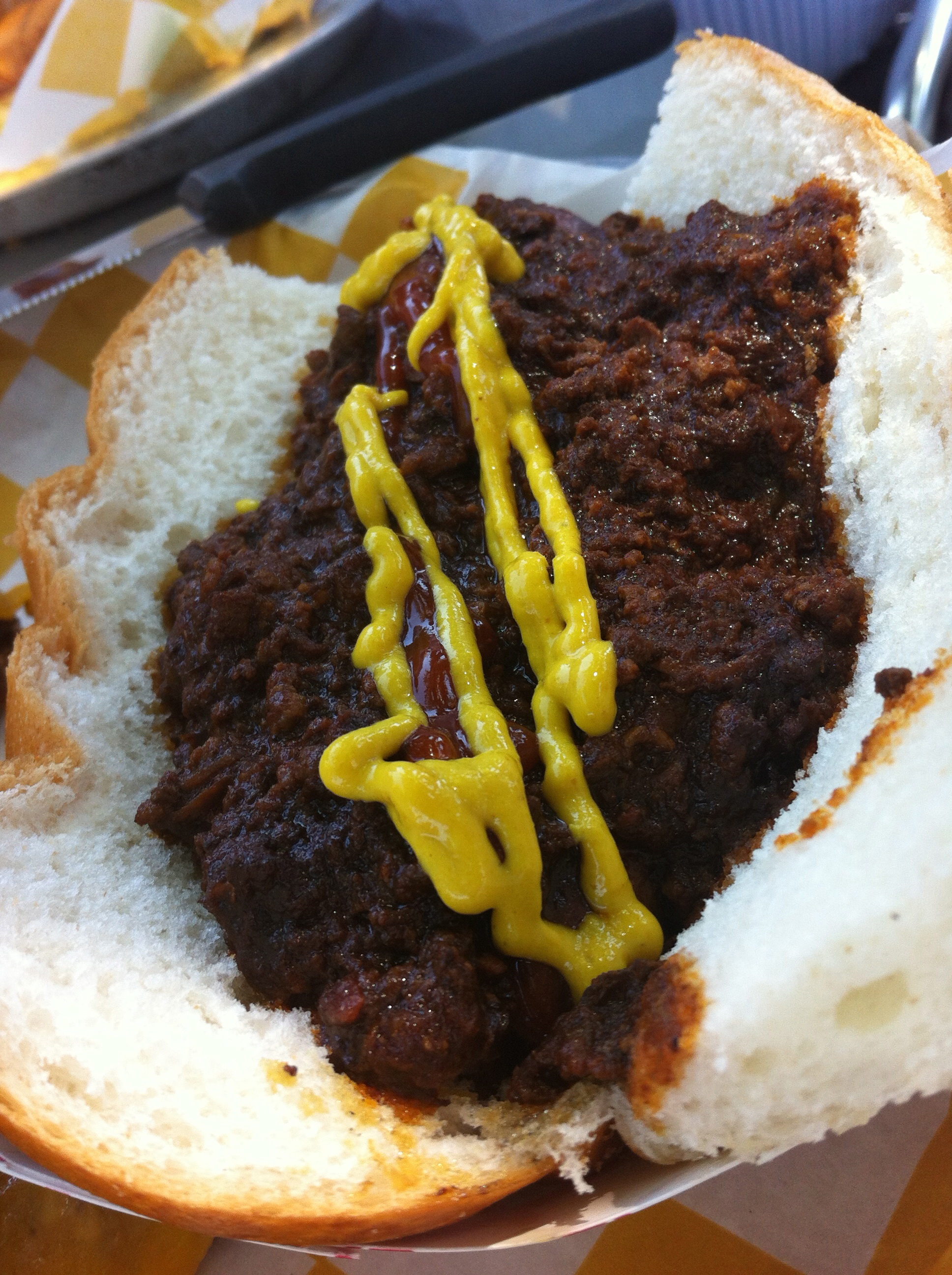 The first thing that I noticed was that the chili on the dog was made from pulled brisket, as opposed to ground beef and had quite a bit of a kick to it. Nice, although there was a LOT more chili than dog, even more noticeable on the over-sized bun.