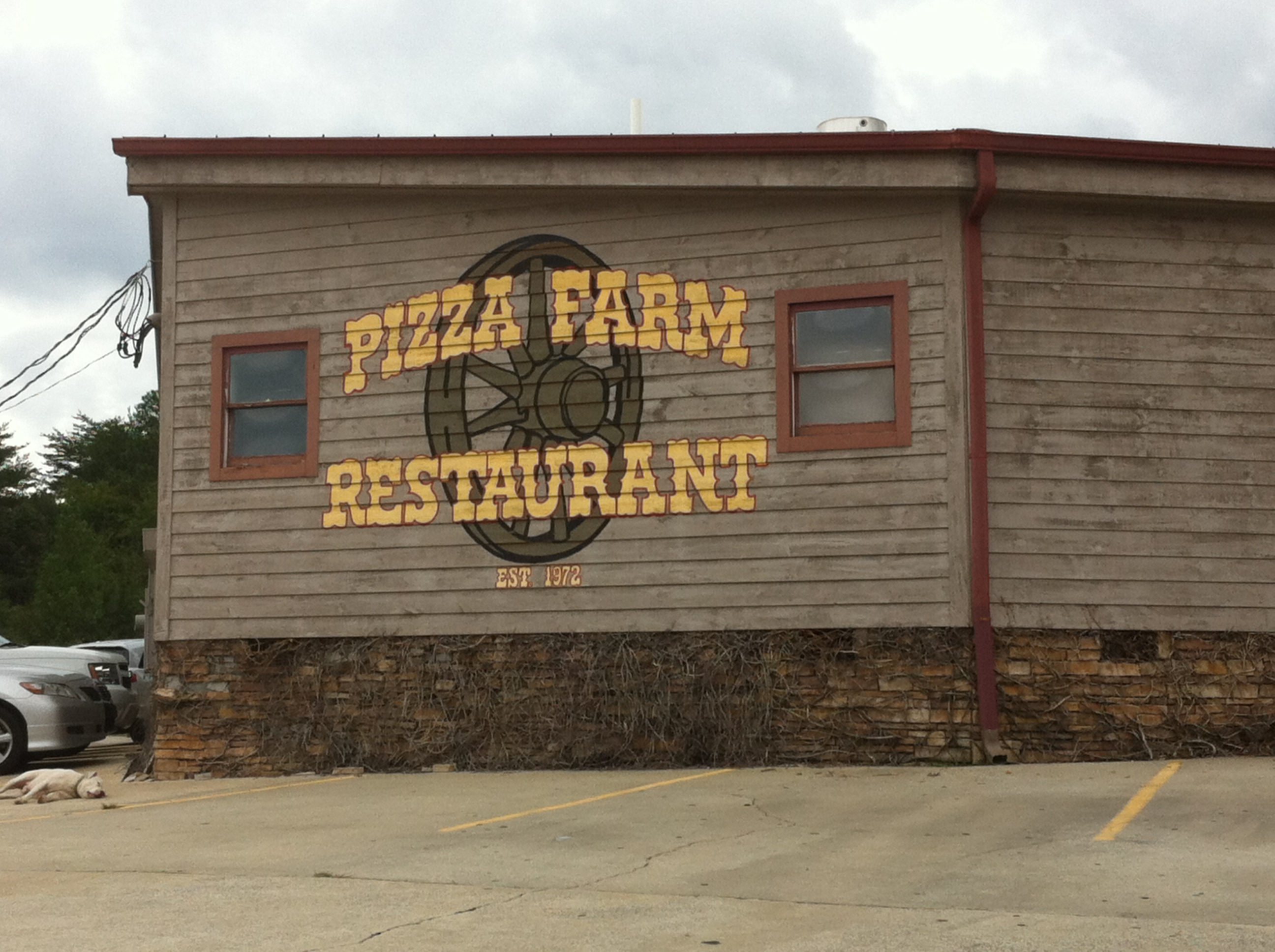 Pizza Farm has been open, basically in a pasture, in Rockmart since 1972. They open at 4:30 on Saturday, a fact that we realized when we arrived at 4:10 and the front door was locked. So we circled town (twice), got back at 4:20 and waited ten minutes (along with several pickup trucks in the parking lot) for them to open.