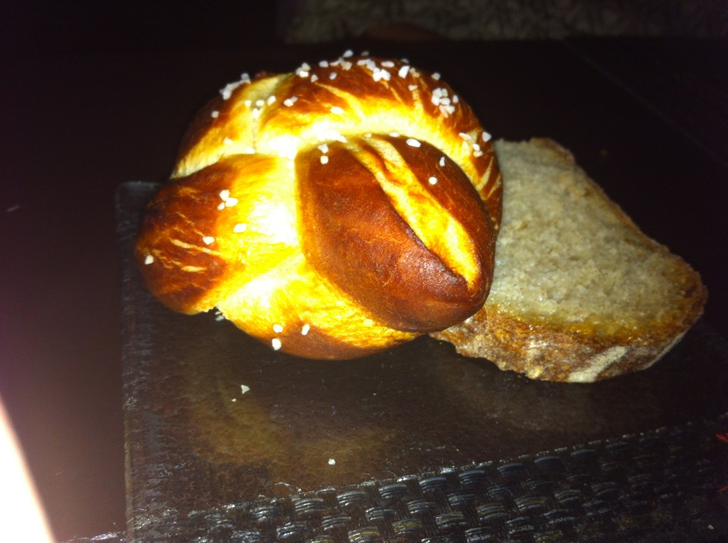 The second waitperson (Alice) showed up with some delicious breads (pumpernickel, roasted wheat, house-made focaccia and house-made pretzels) along with a gruyere pop-over of some sort (which was heavenly) and that kept us occupied waiting for our starters.