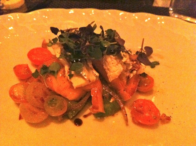 I began with a heirloom tomato salad with what I thought was goat cheese (but turned out to be bleu cheese – I apparently, and somewhat tragically, cross-read items on the menu), red onions and white anchovies. The heirloom tomatoes were excellent, particularly the green variety on the bottom of the stack, but the bleu cheese was STRONG and the anchovies were too much – I ate one, leaving the other.