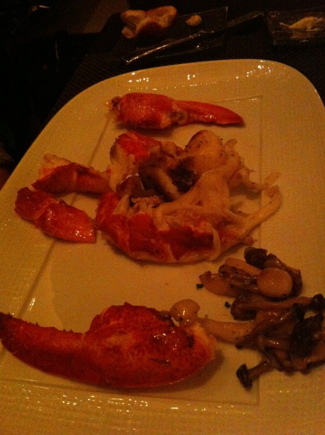 Jo ordered the lobster with a side of wild mushrooms. The lobster arrived, table-side, fairly whole and Bonito de-shelled it for her. This was quite a show in itself, and it resulted in quite a stack of lobster, which was served with a black truffle emulsion and drawn butter. I’m not a huge lobster fan, but it tasted like good lobster to me. Jo ate most all of it, save for the meat from one of the claws that was a little too “mushy”.