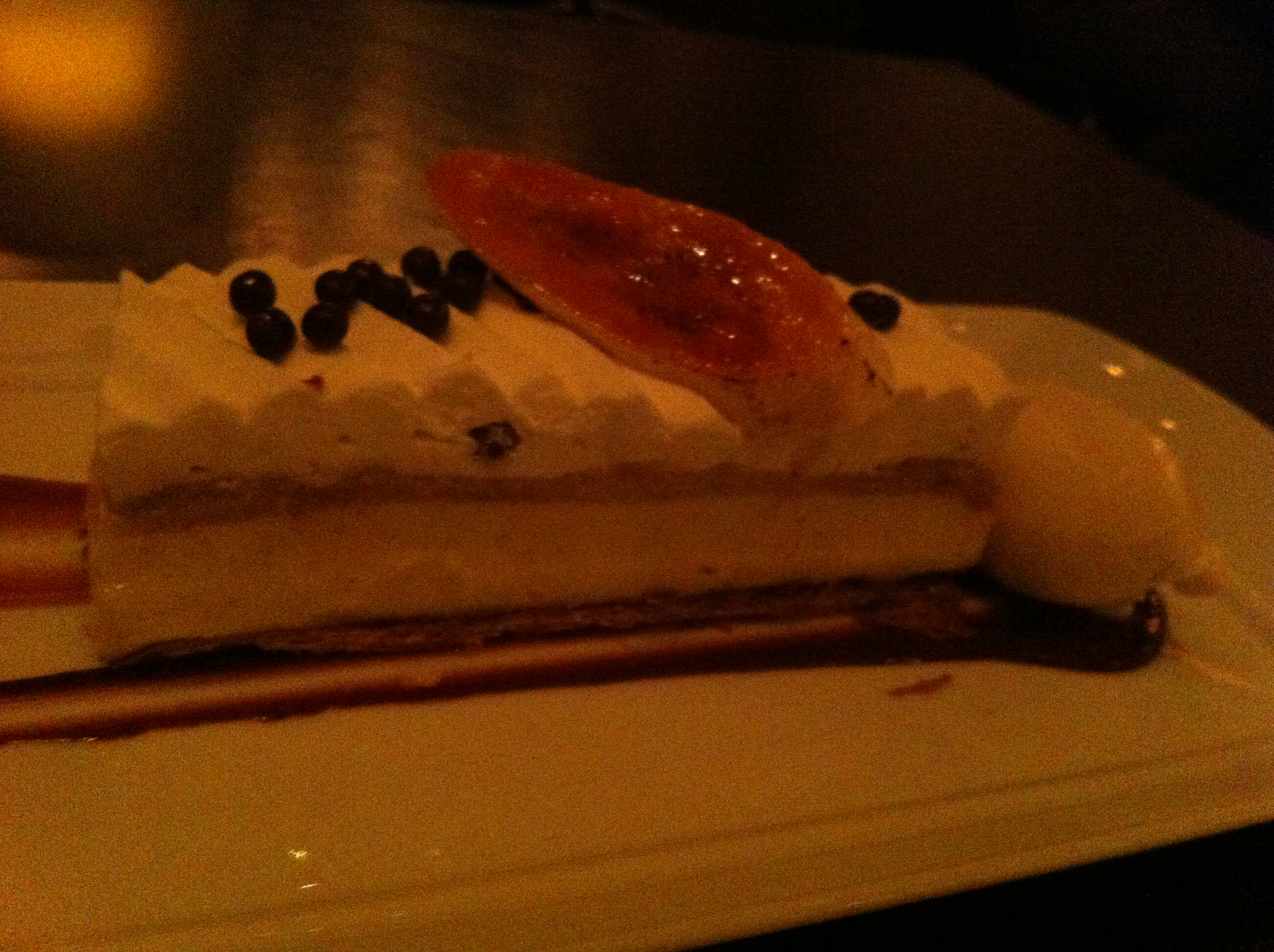 The BCP was like an eclair, on a crisp cracker with caramel and a ten-year (supposedly the name “ten-year” comes from the fact that it took the chef ten years to come up with this sauce) chocolate sauce and a caramelized banana. The dessert was good but, all things considered, I’d probably have preferred to have two more ounces of that heavenly wagyu beef.