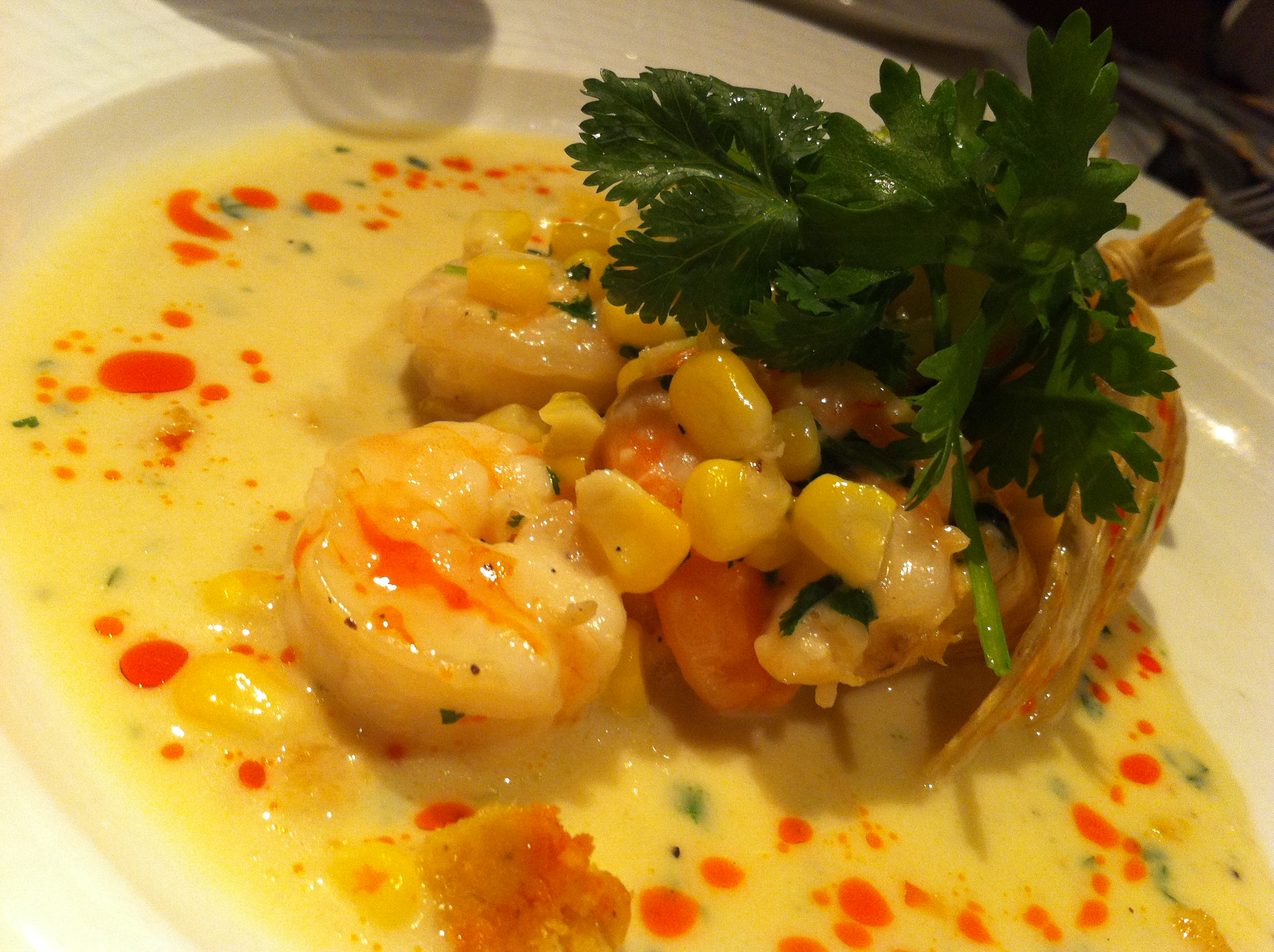 As we were one table away from the back wall, she could see almost the entire restaurant. My view, however, was in the opposite direction – through the glass walls and all I could see was the giant television screens and computer output from the Sports Book at Caesar’s. We started out by sharing a tiger shrimp and roasted corn tamale appetizer, served with a corn-cilantro sauce.