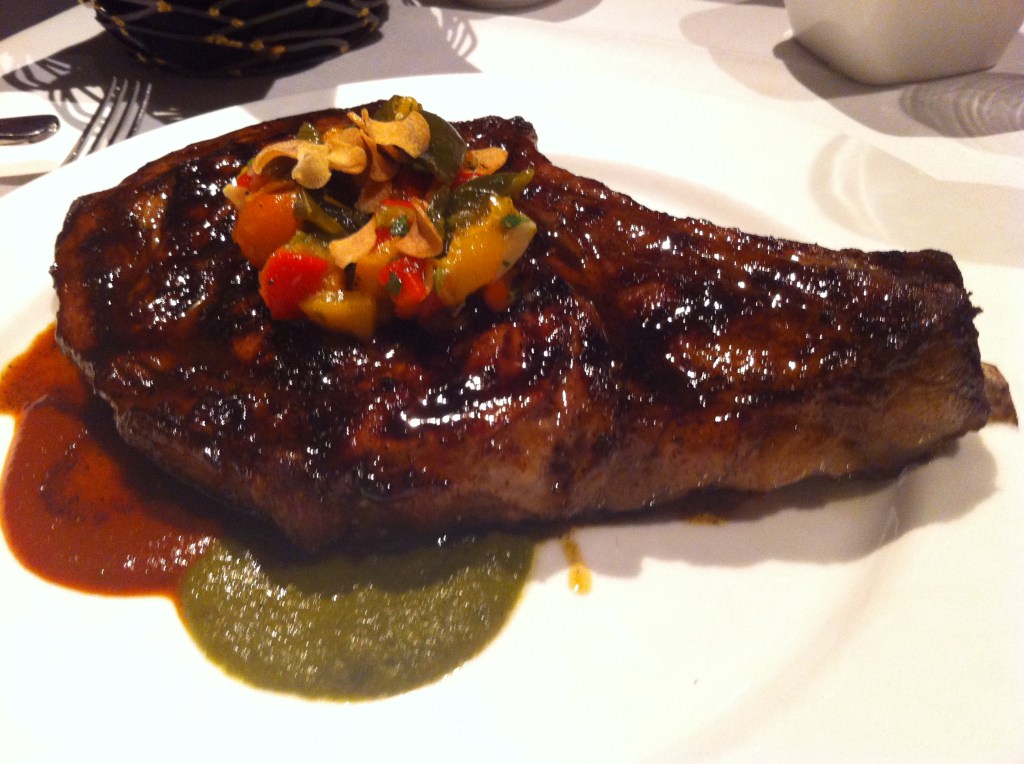 I was torn between a couple of entree choices, but, after a discussion with the server, I chose the 22 oz bone-in ribeye with red and green chile sauces.