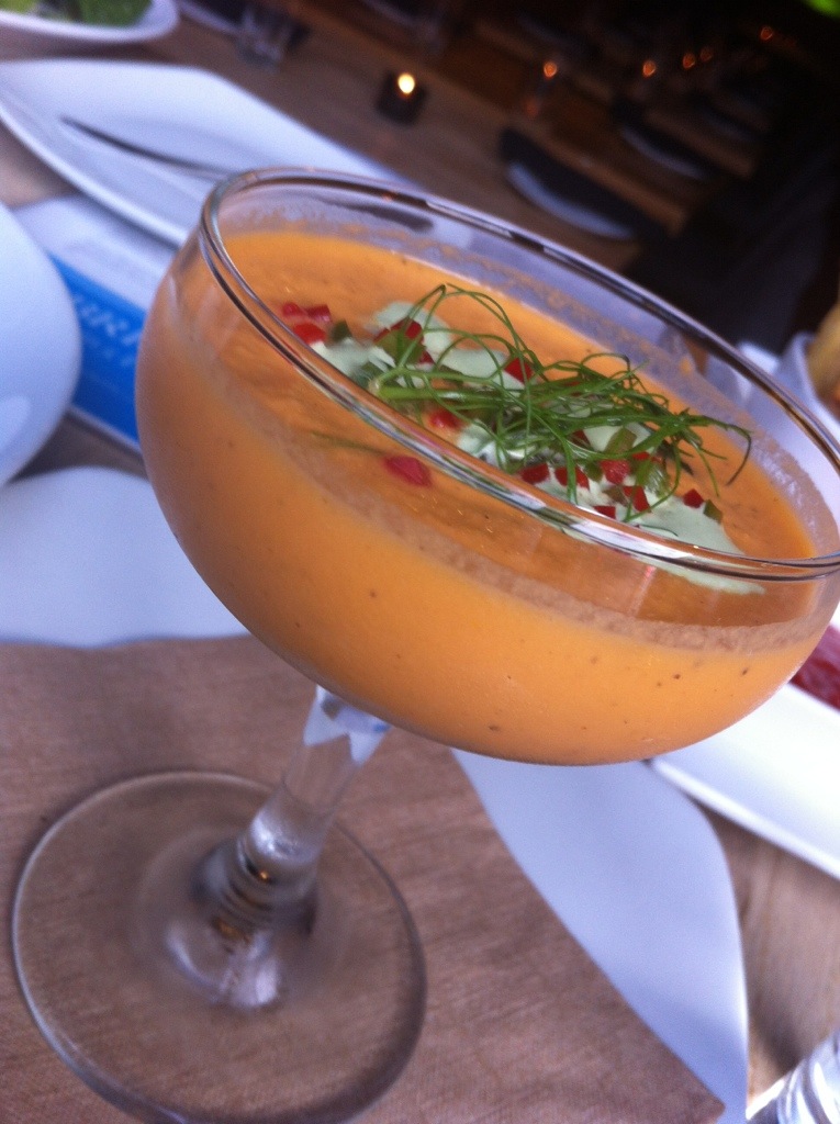 After much discussion among us about the small menu (19 total items) and talking with the server, we learned that everything is a “small plate” (their description, not mine – the plates were actually pretty good sized). We decided to treat it like tapas and go with 6 plates total. I started with their smoked gazpacho (pictured above) with cilantro crema and bell pepper confetti. We both deemed it as “smoked” something. It was cold, like gazpacho but there was not really much tomato taste to it at all.