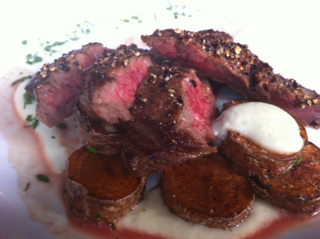 I also ordered skirt steak au poivre (at the recommendation of the server) with confit fingerling potatoes and a dijon-fennel soubise (Google tells me that a soubise is an bechamel sauce with onion added – no wonder I kind of liked it).