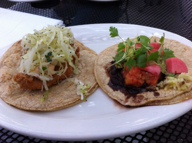 Jo chose (on the left) a fried sword fish taco with mexican slaw and chipotle aioli and (on the right) a vegan taco with black beans, rice, radish, avocado, and ecuadorian salsa, both on corn tortillas.
