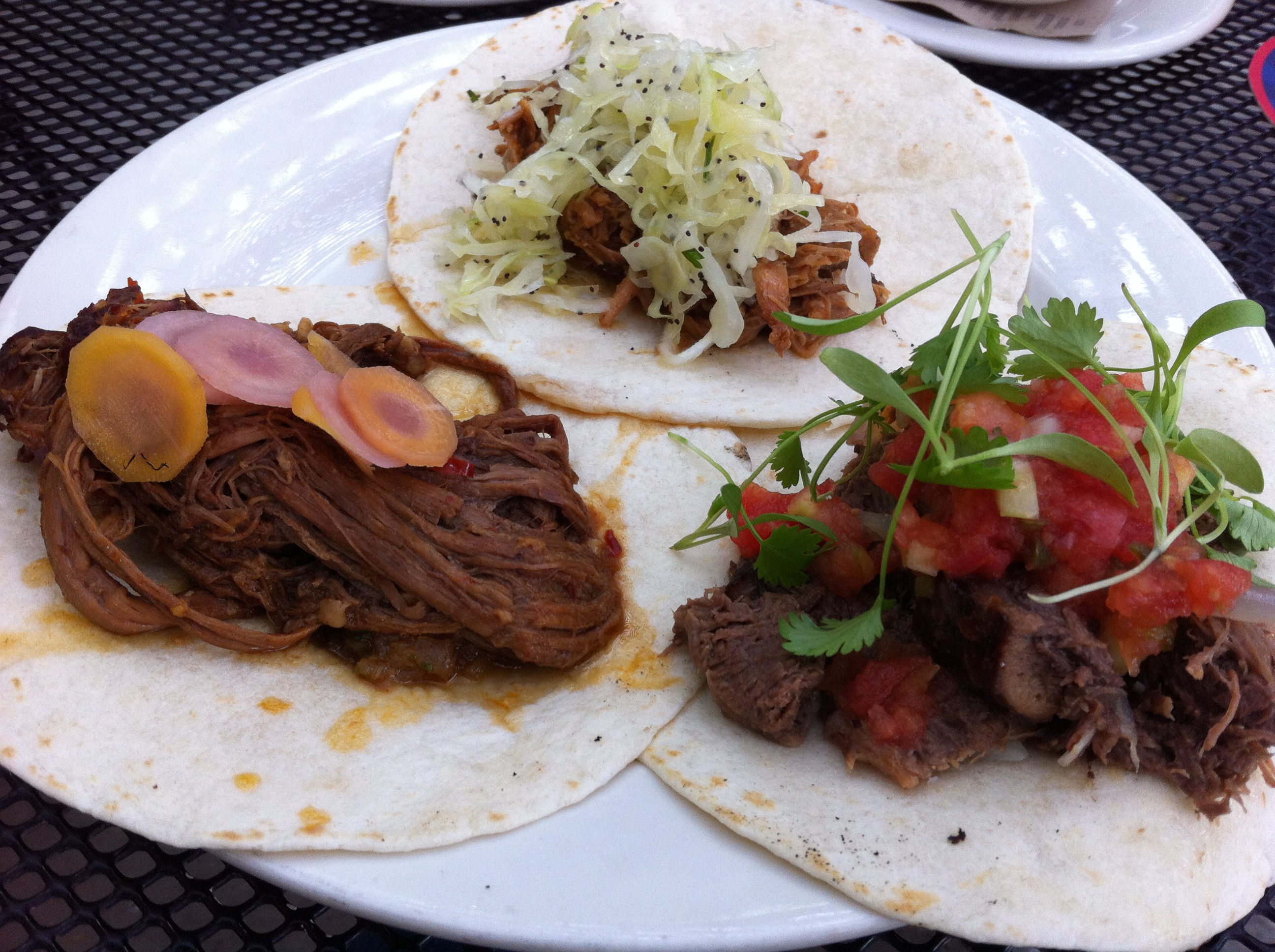 Being the adventurous sort, I chose (starting bottom left and going clock-wise): slow cooked grass-fed beef brisket with vidalia onion relish and carrots escabeche; 12 hour roasted pork shoulder with mexican slaw; and roasted beef tongue with tomato cucumber salsa and Ashland Farms cilantro, all on flour tortillas.